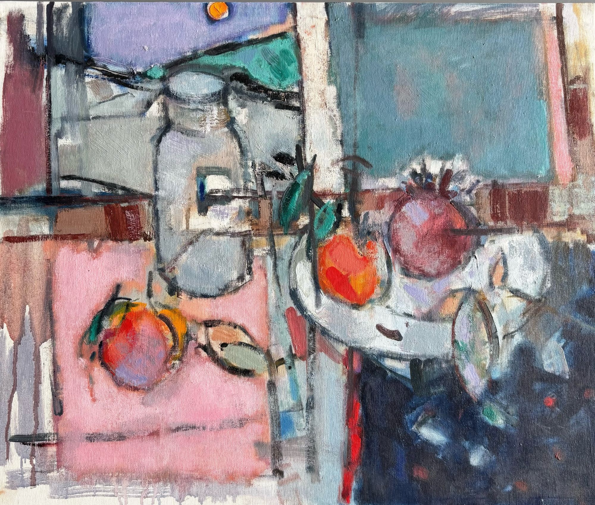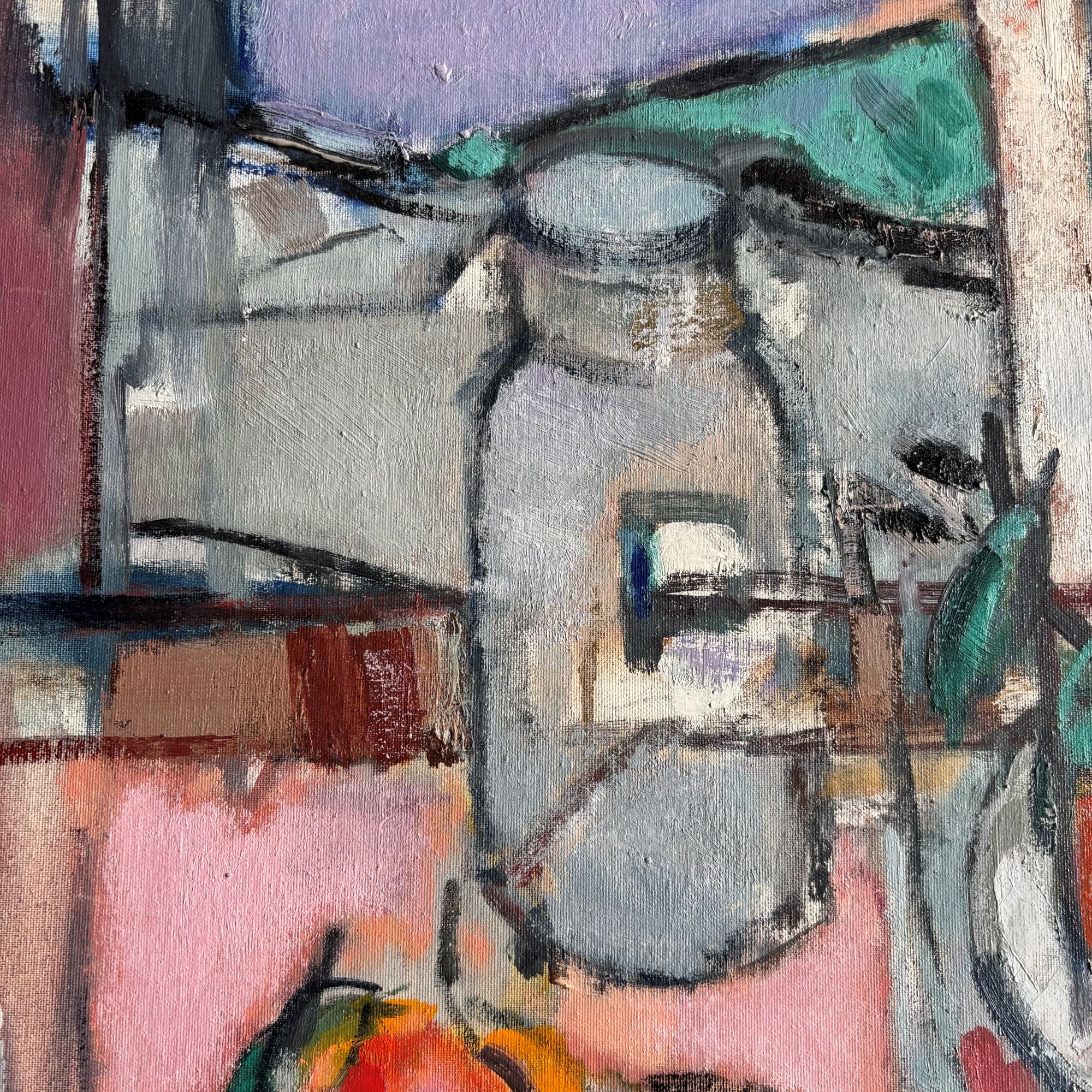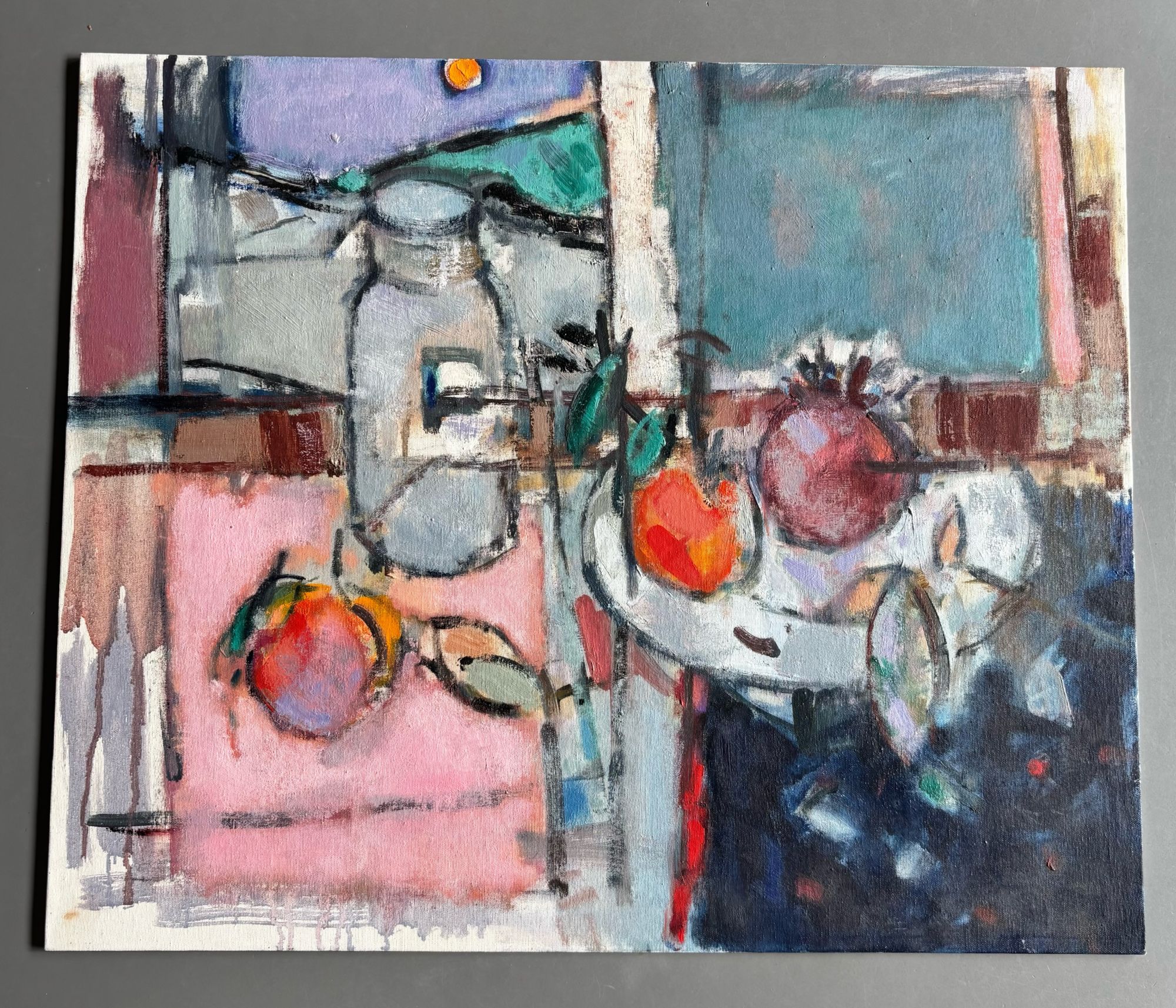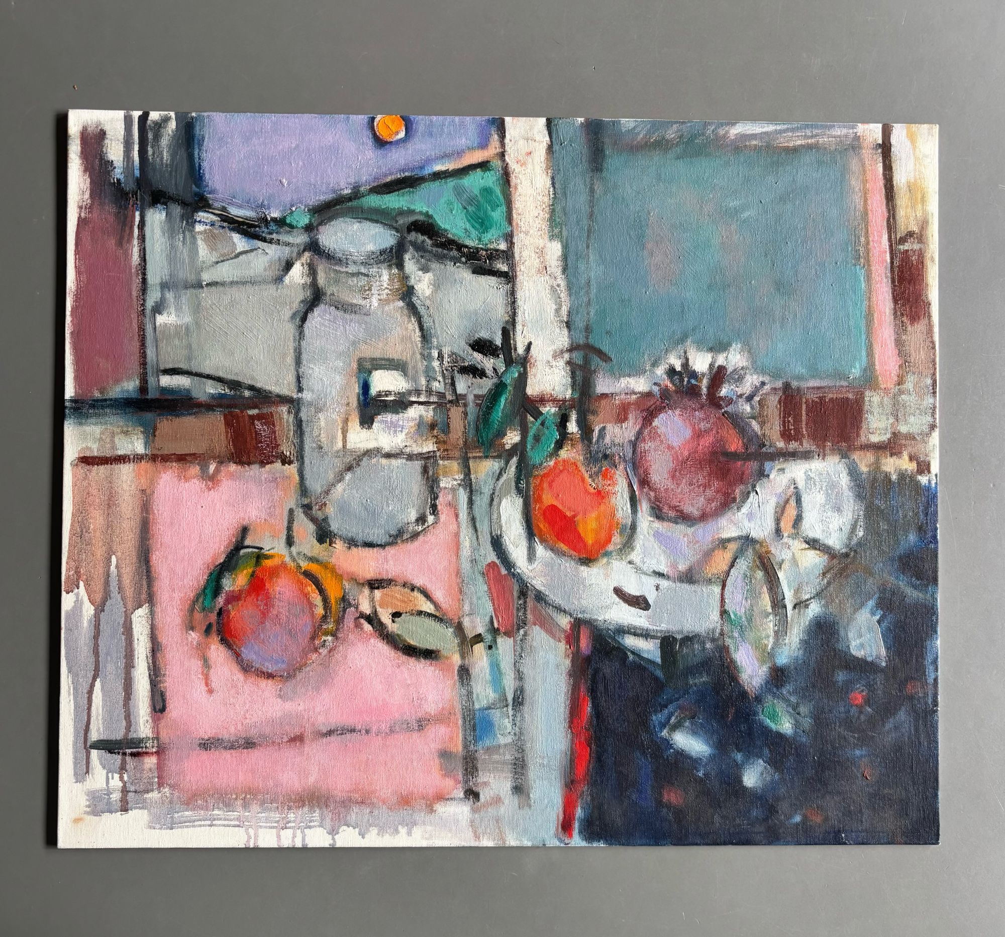 Colorful still life of a kitchen setting, oil on canvas board, unframed