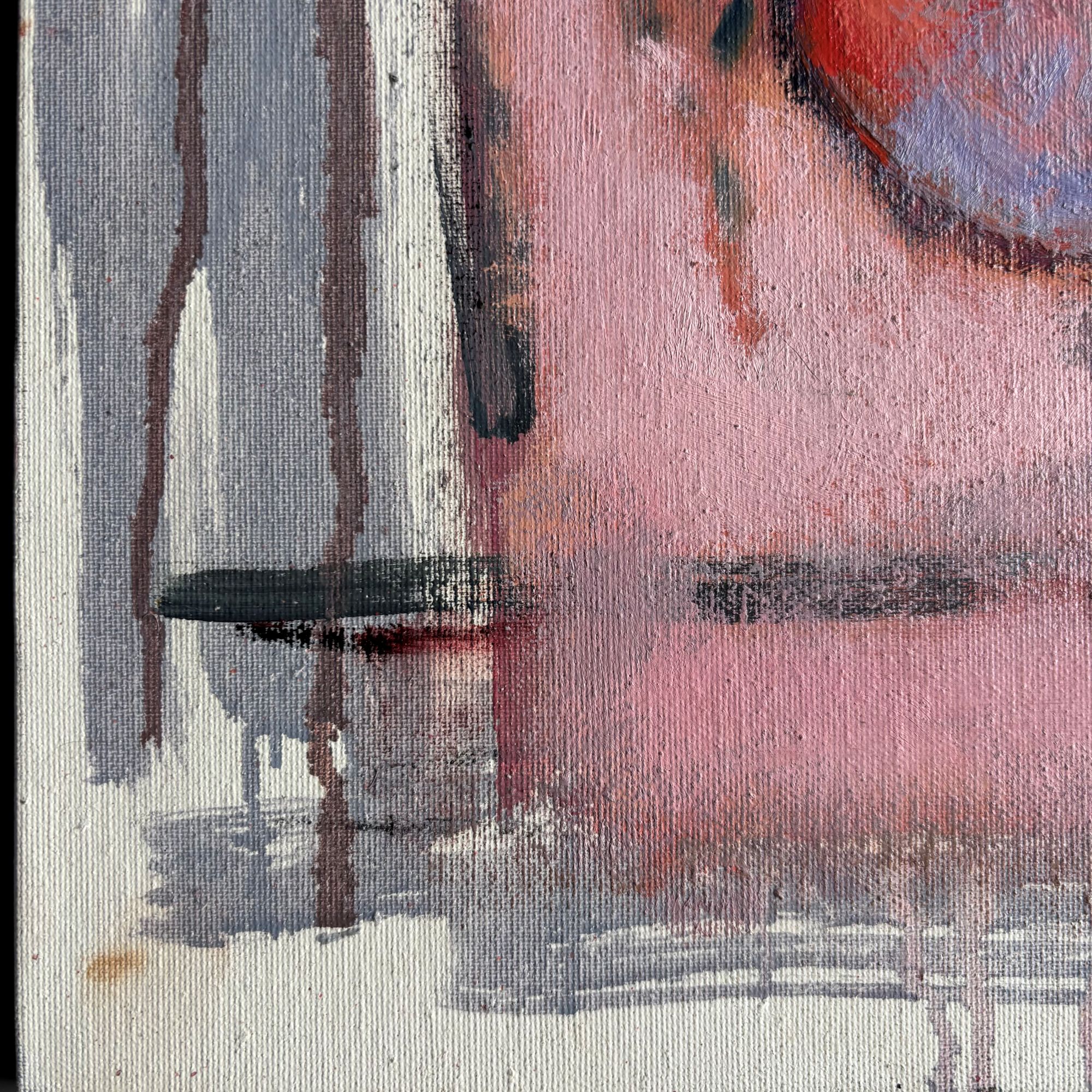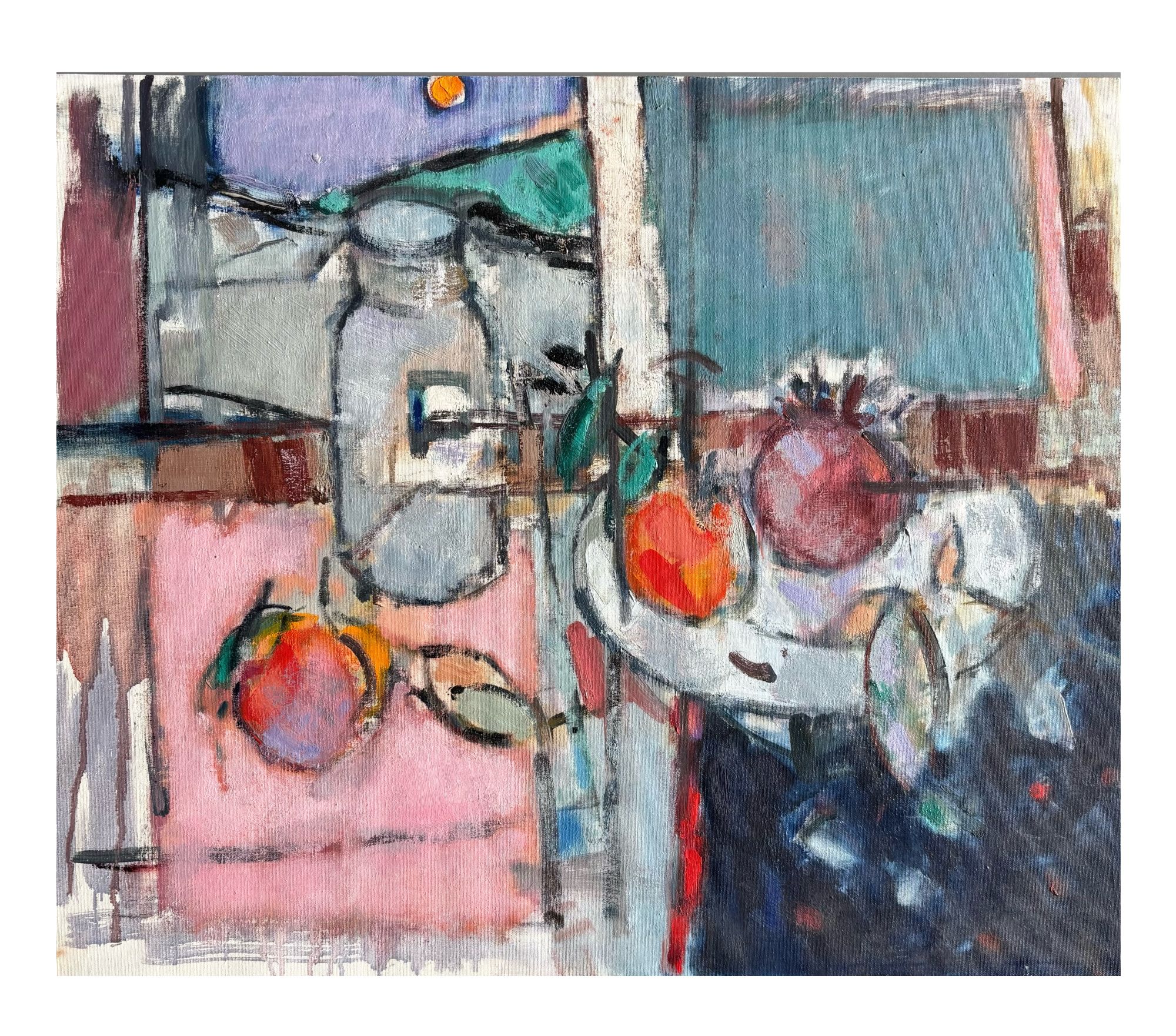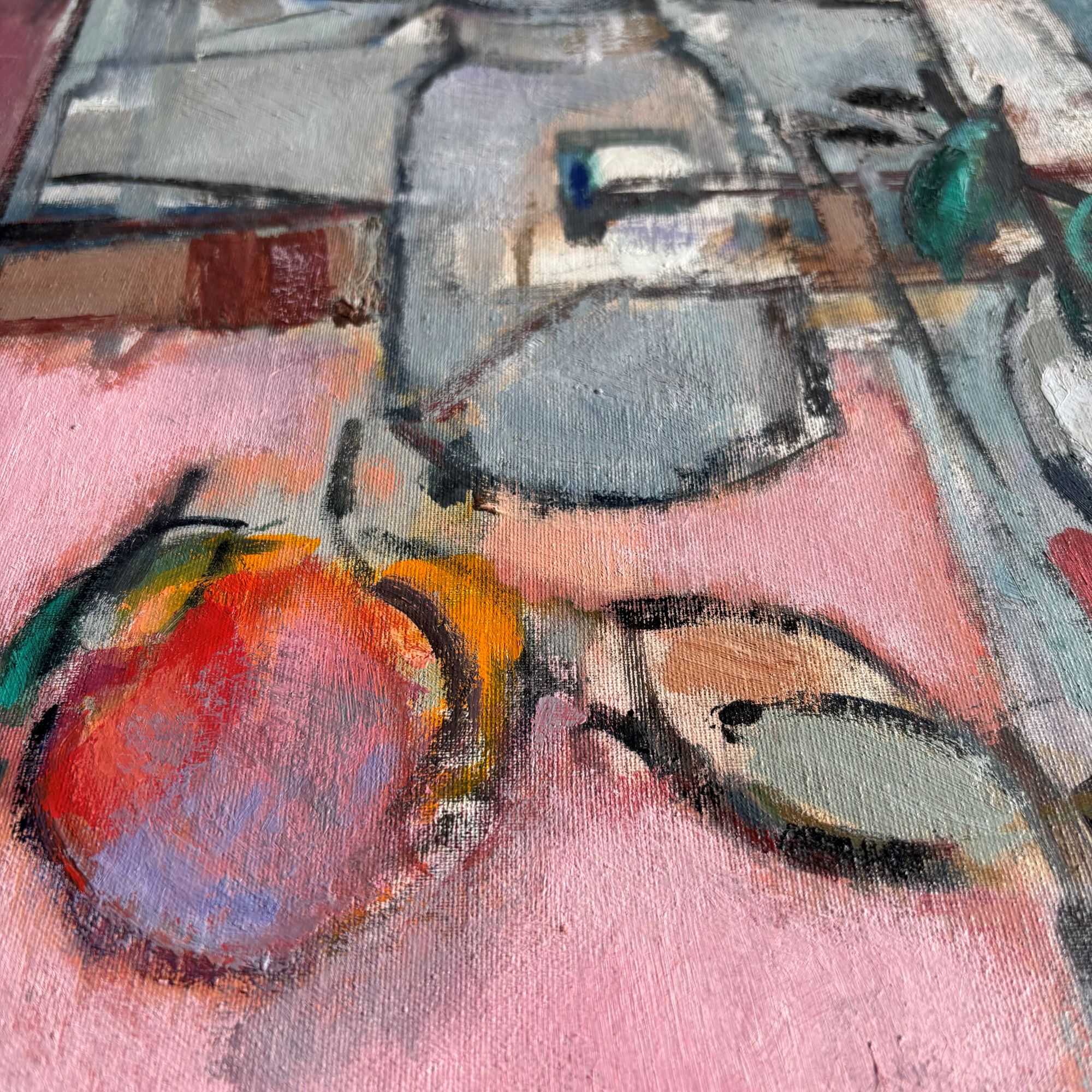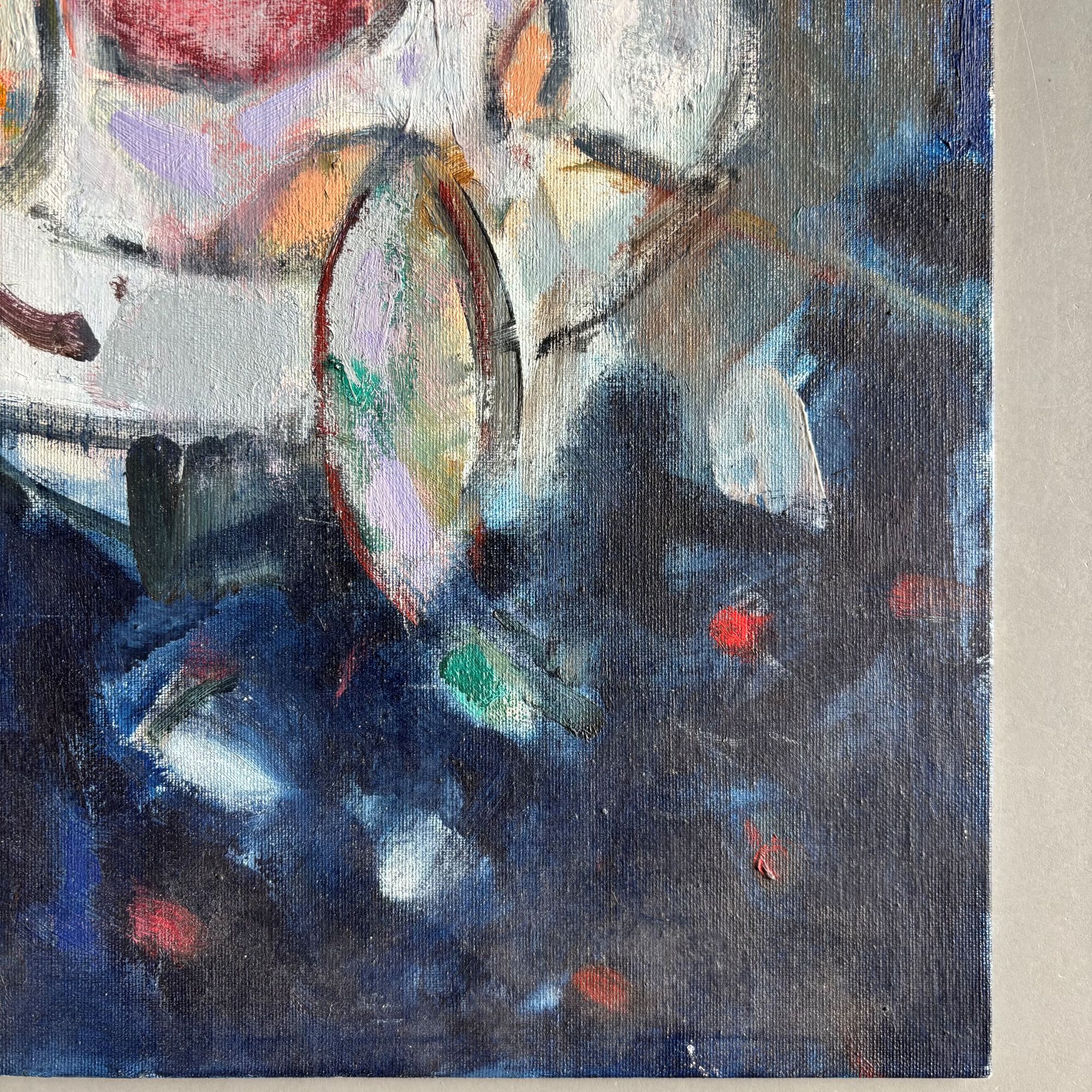 Colorful still life of a kitchen setting, oil on canvas board, unframed