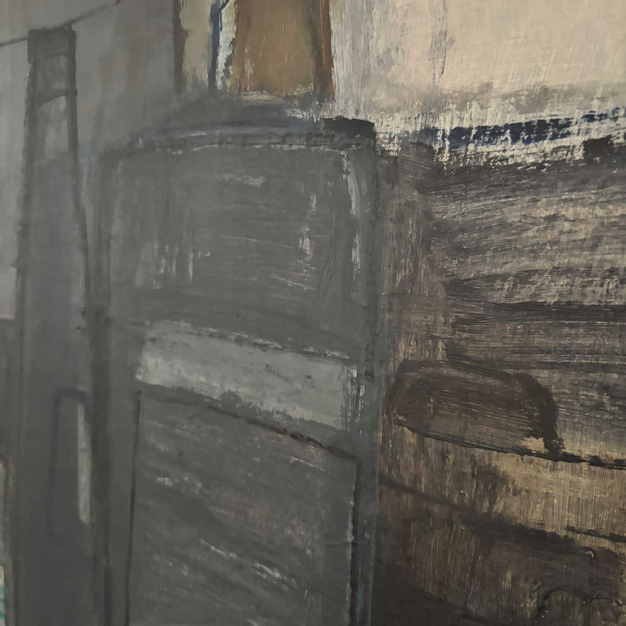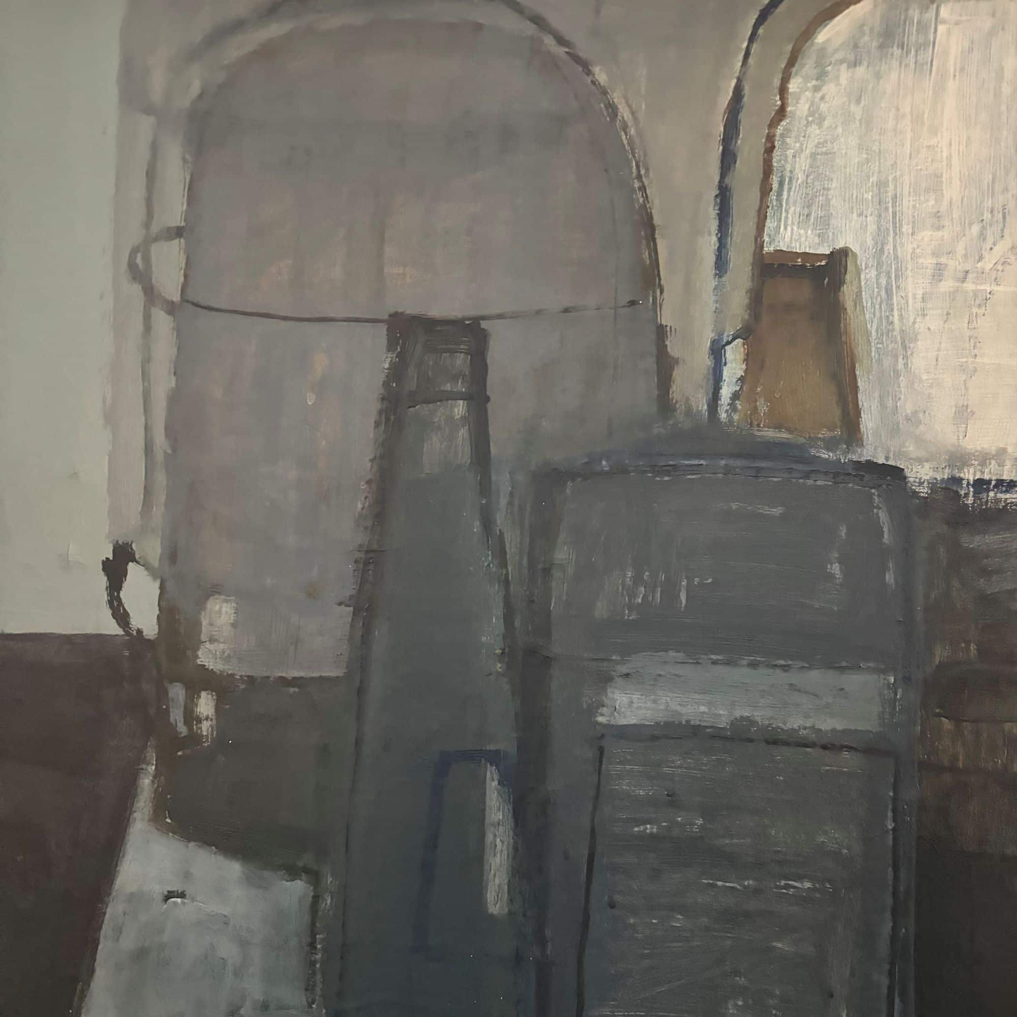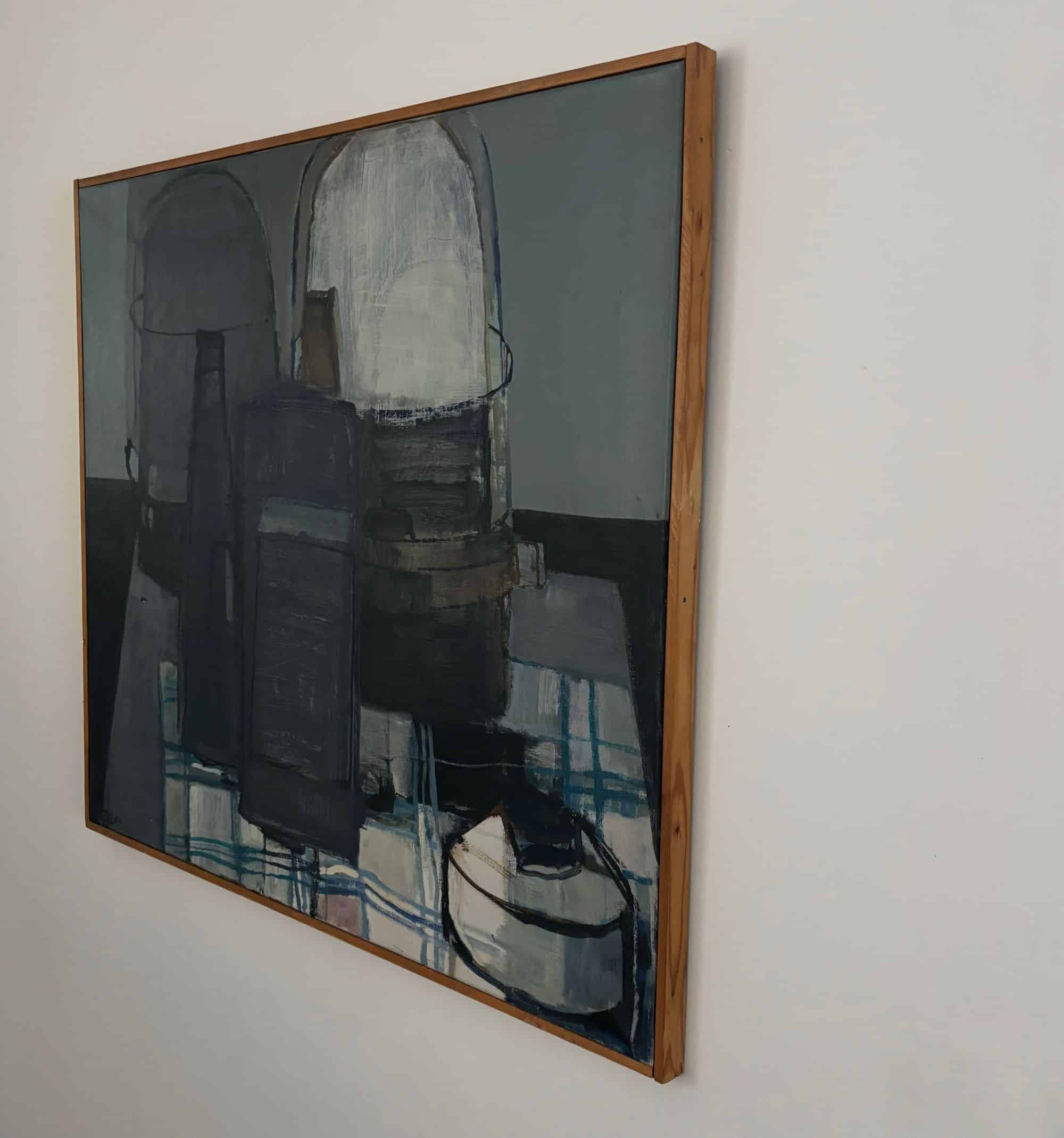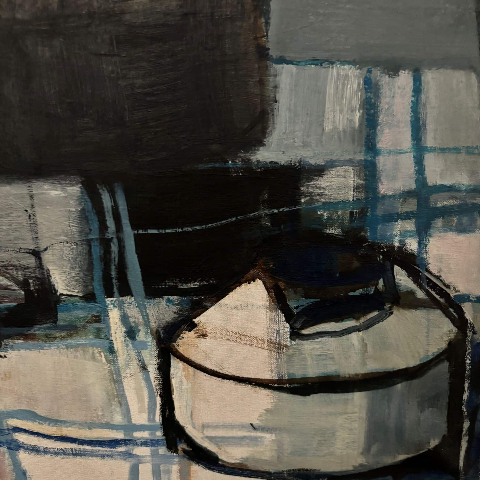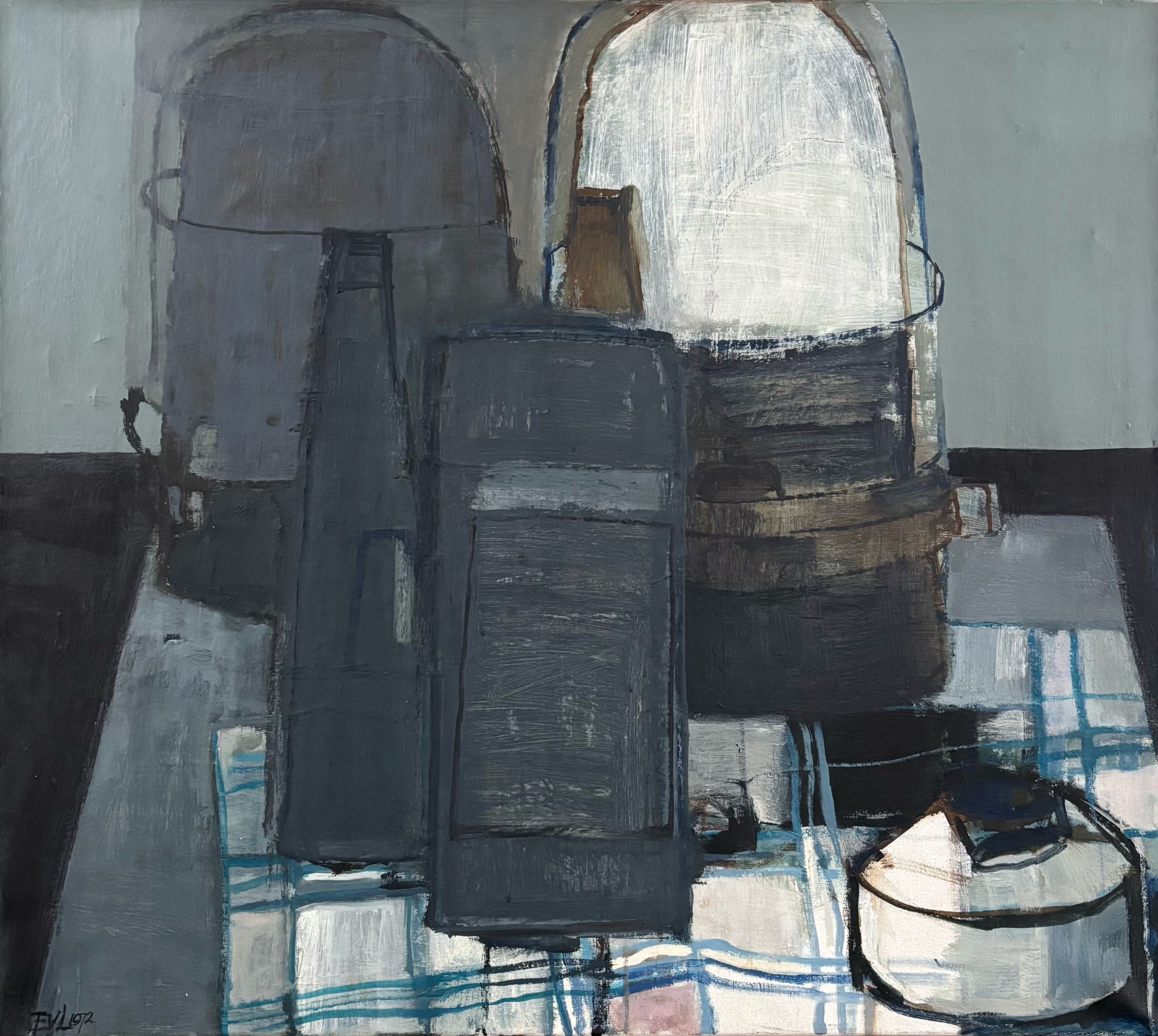 Represented is a still life with a checkered table cloth, bottles, on a table. Dark and light greys, black, white and blue shades.