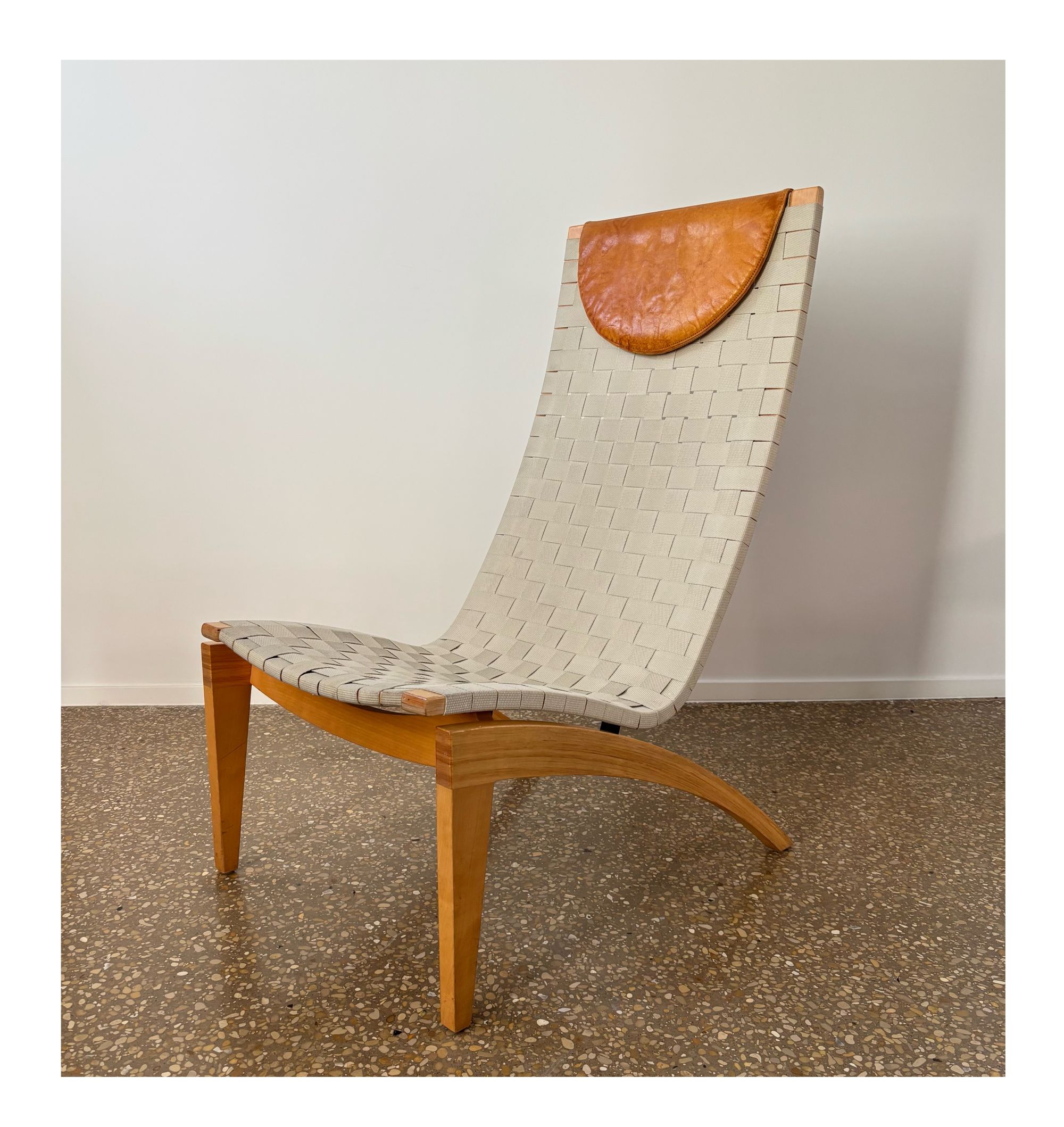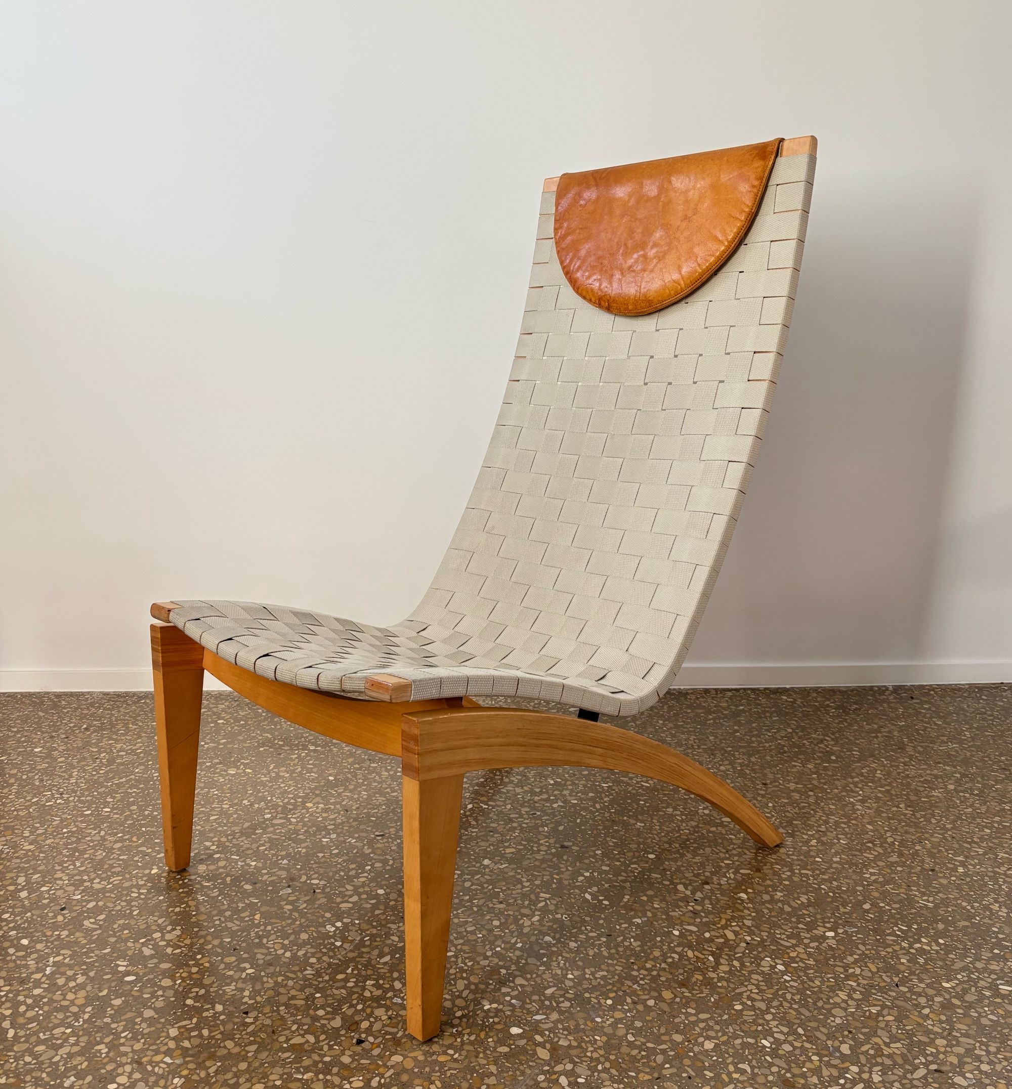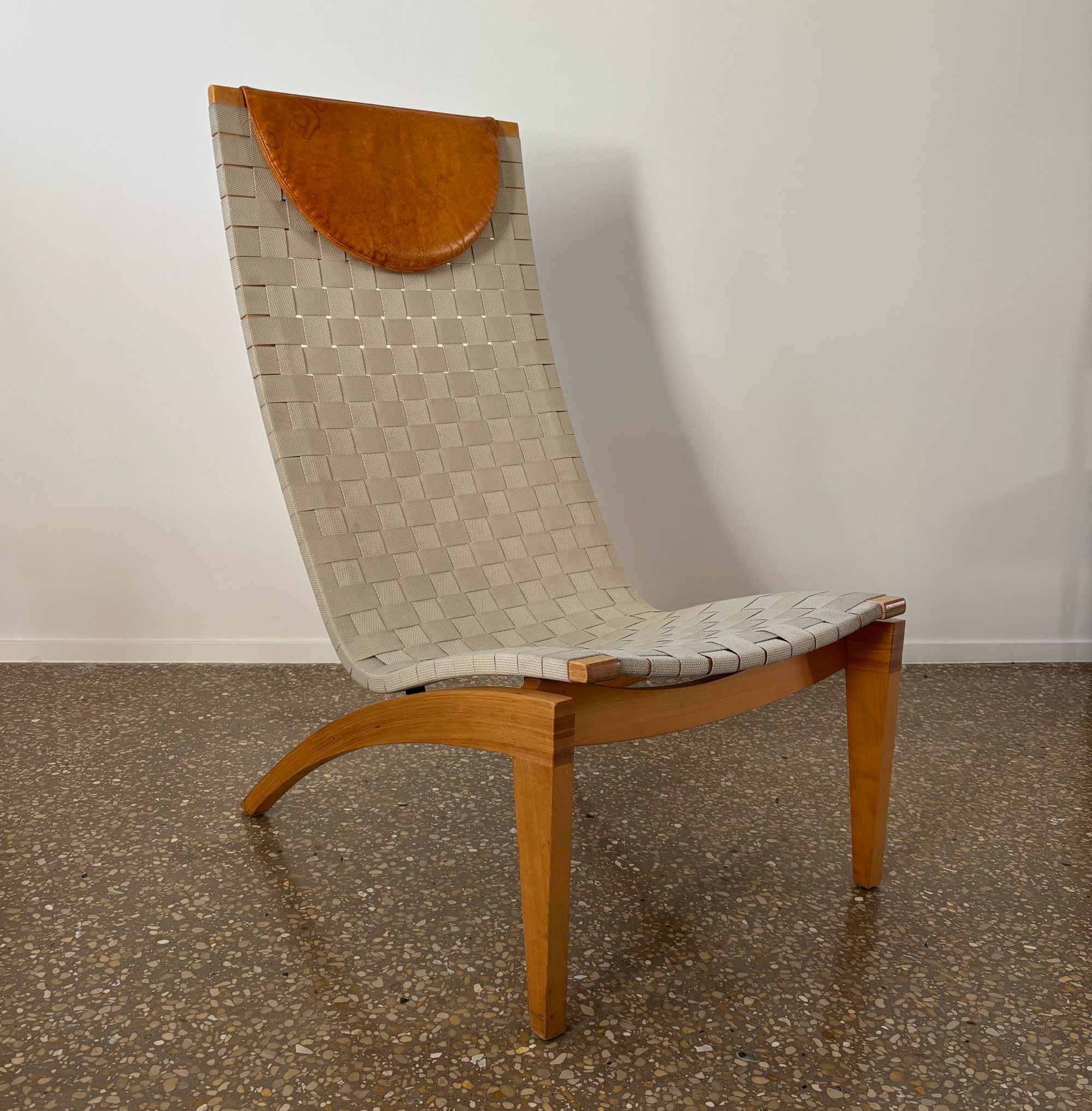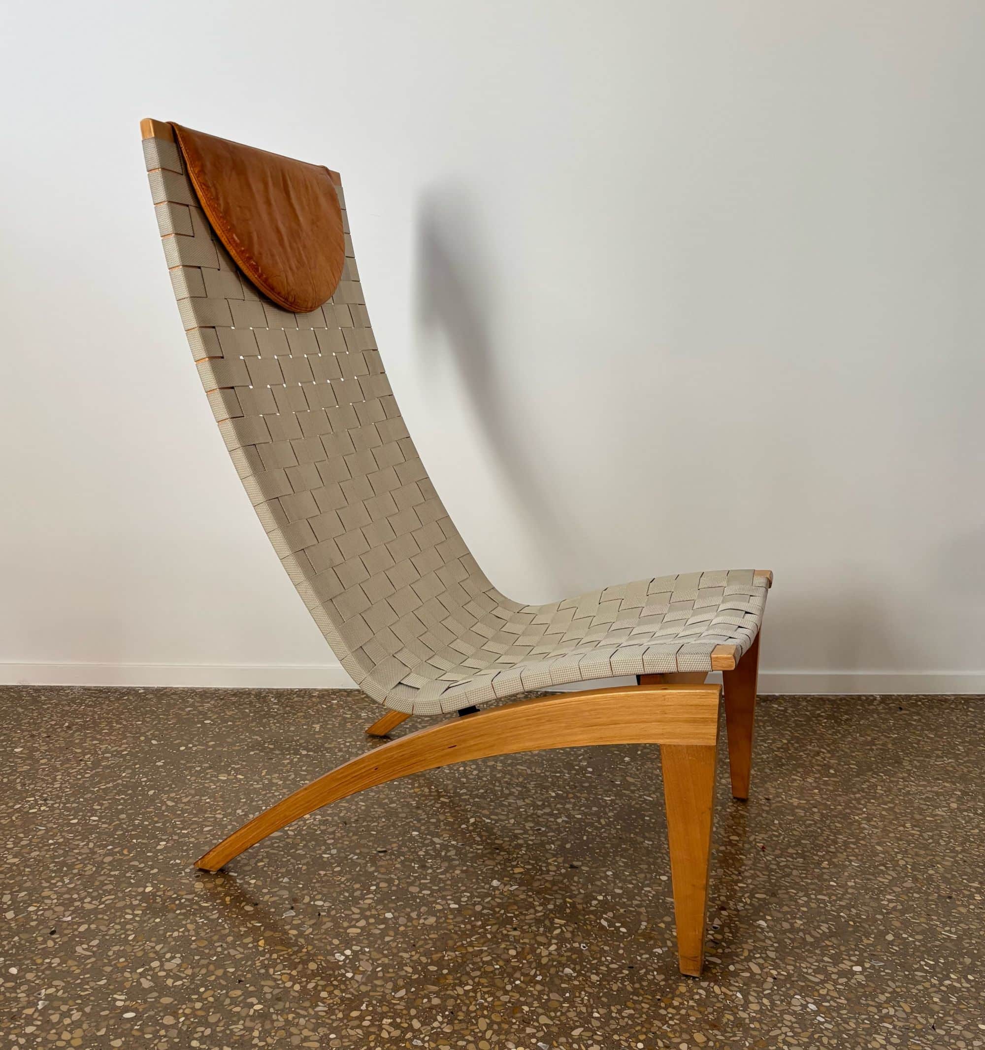 Organically shaped chair made from beech wood and seat/backrest from beige/light grey webbing straps. Loose cognac brown leather head cushion.