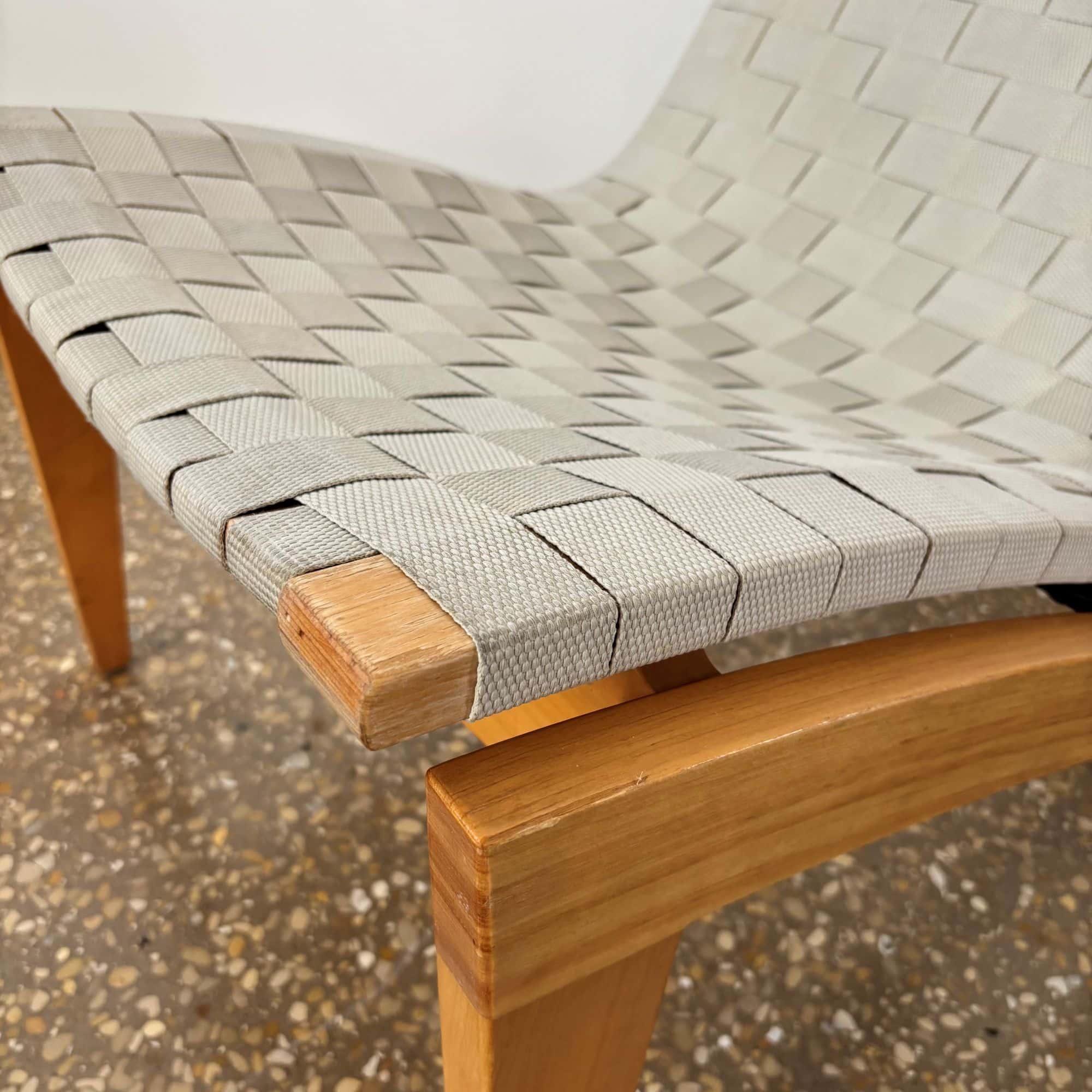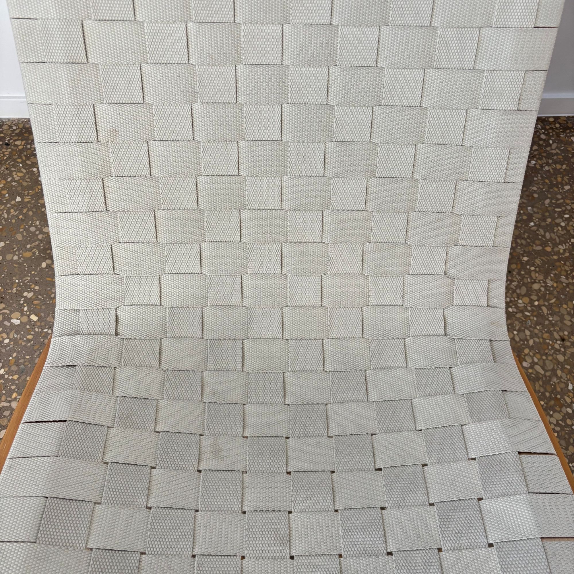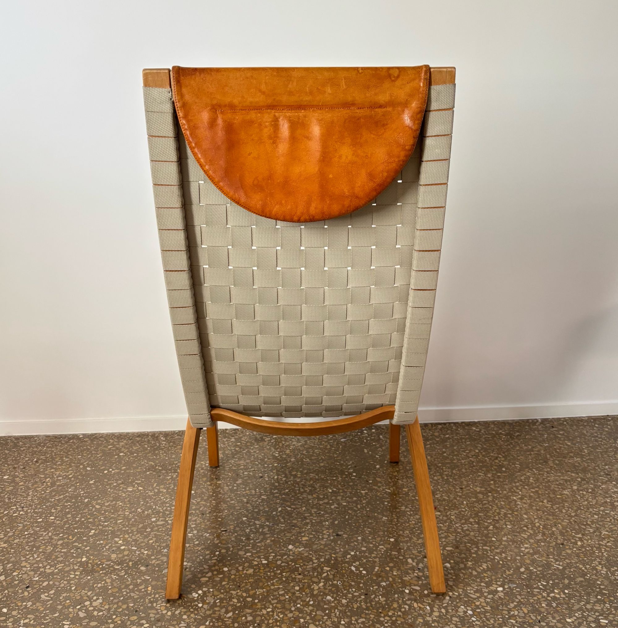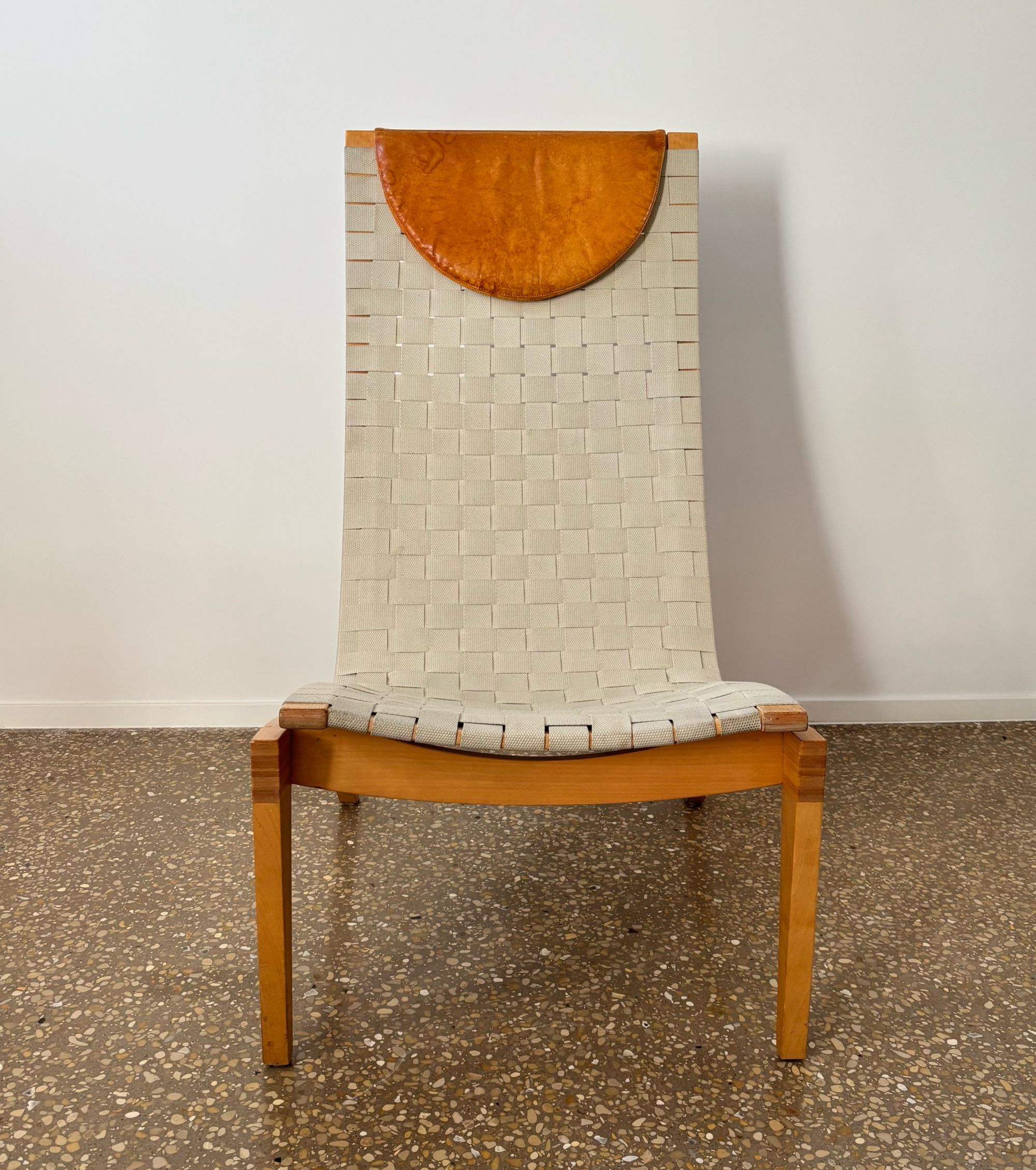 Organically shaped chair made from beech wood and seat/backrest from beige/light grey webbing straps. Loose cognac brown leather head cushion.
