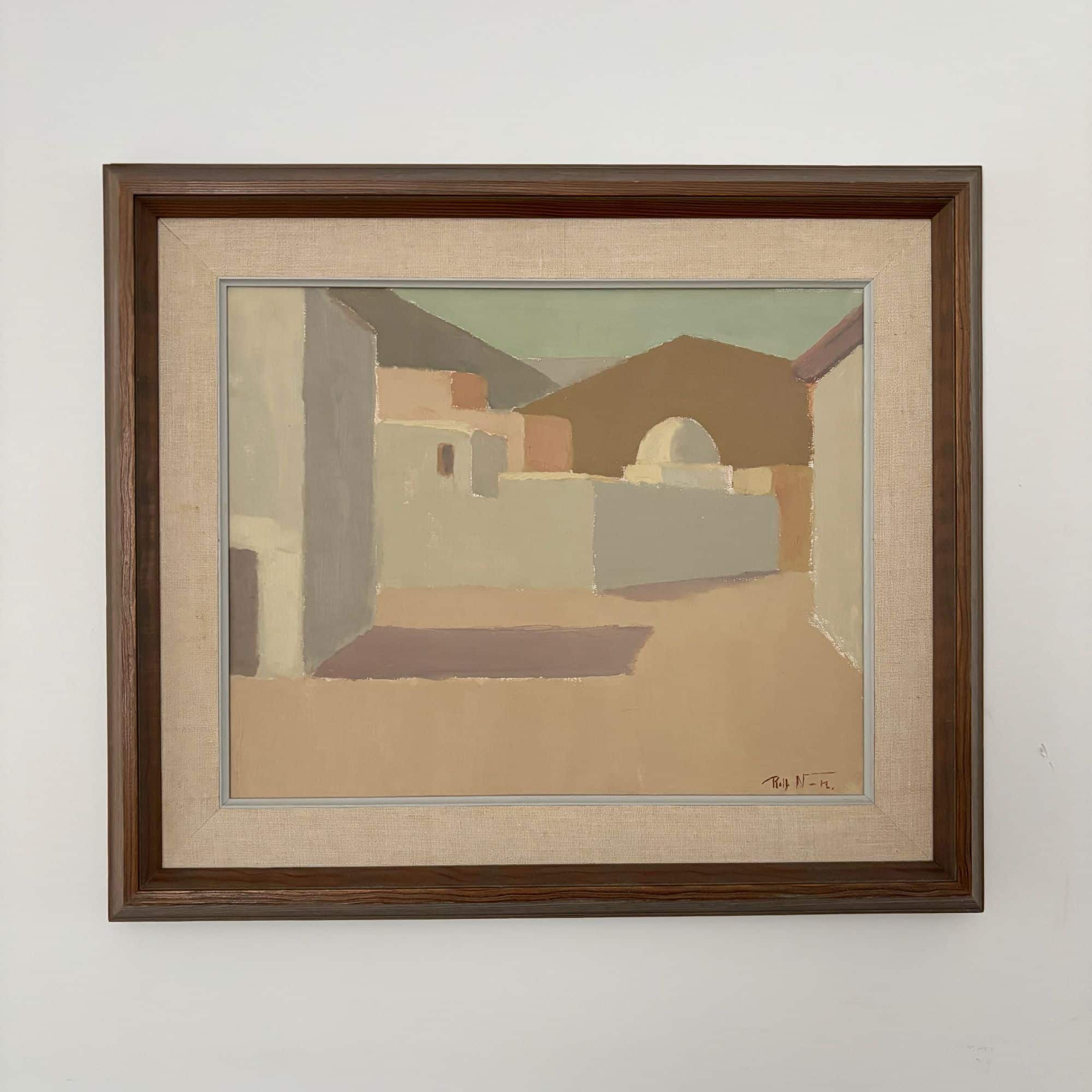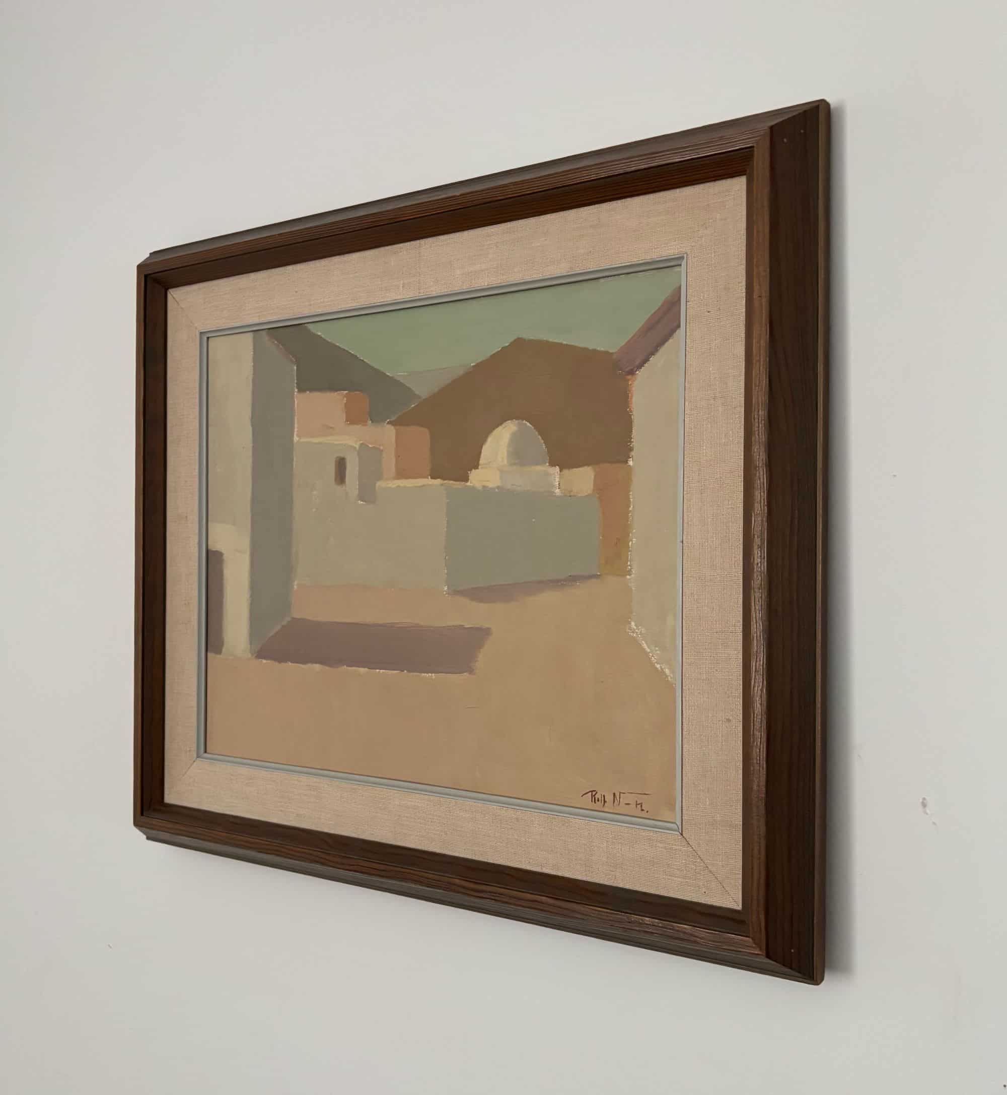 Great painting of stilistic, cubic houses in Spain, signed and dated on backside.