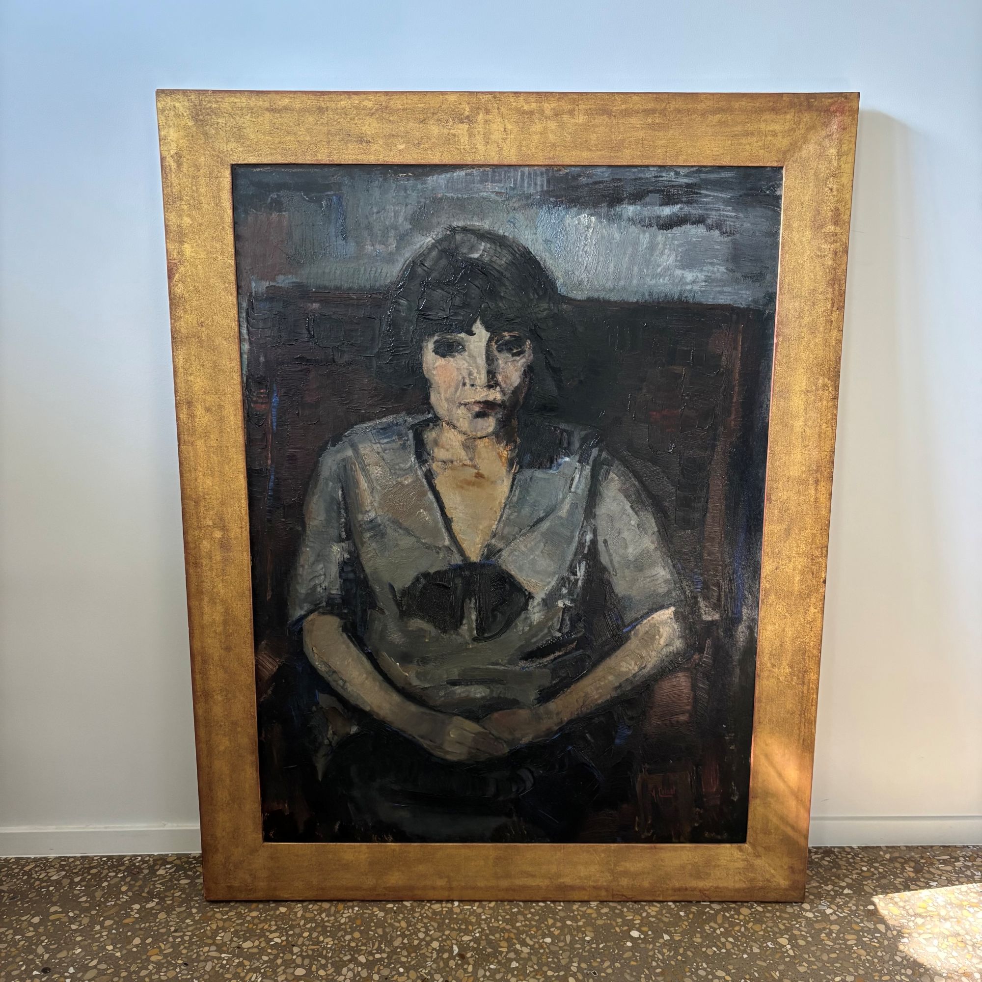 Beautiful painting of a woman sitting down, hands folded and resting in her lap.