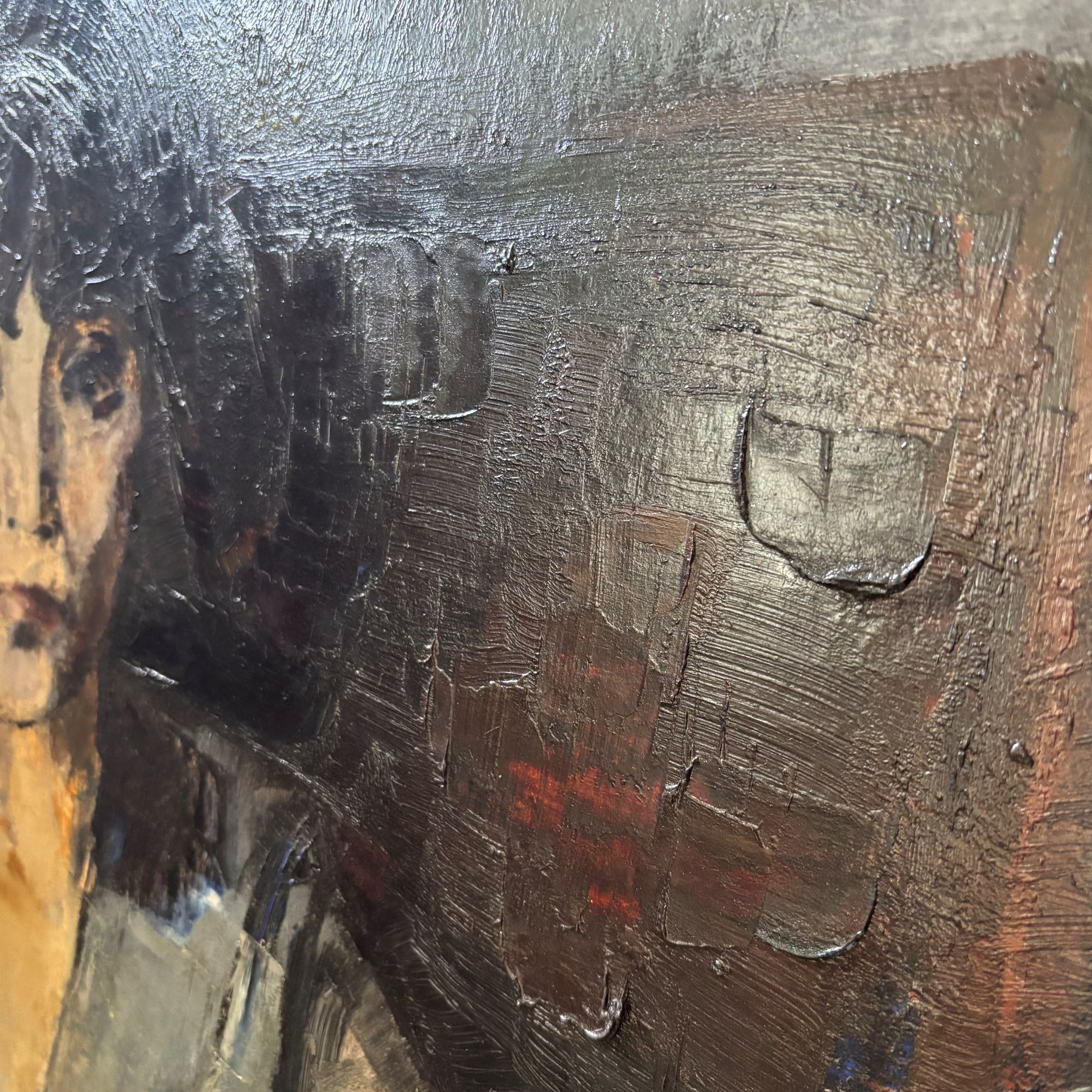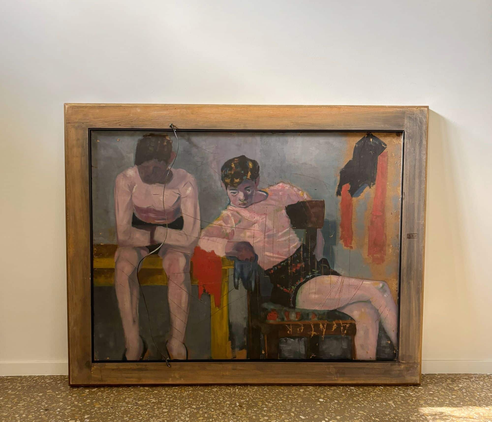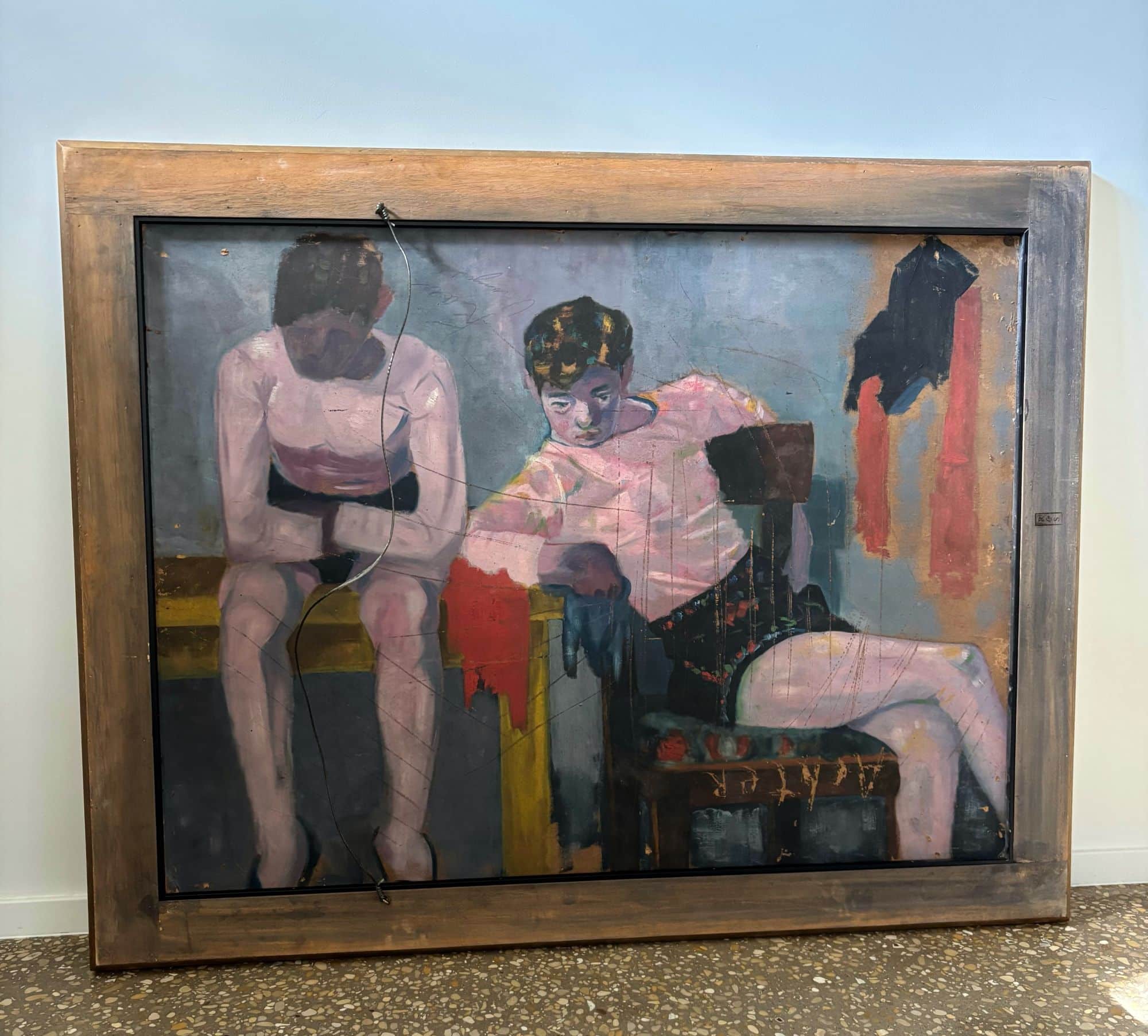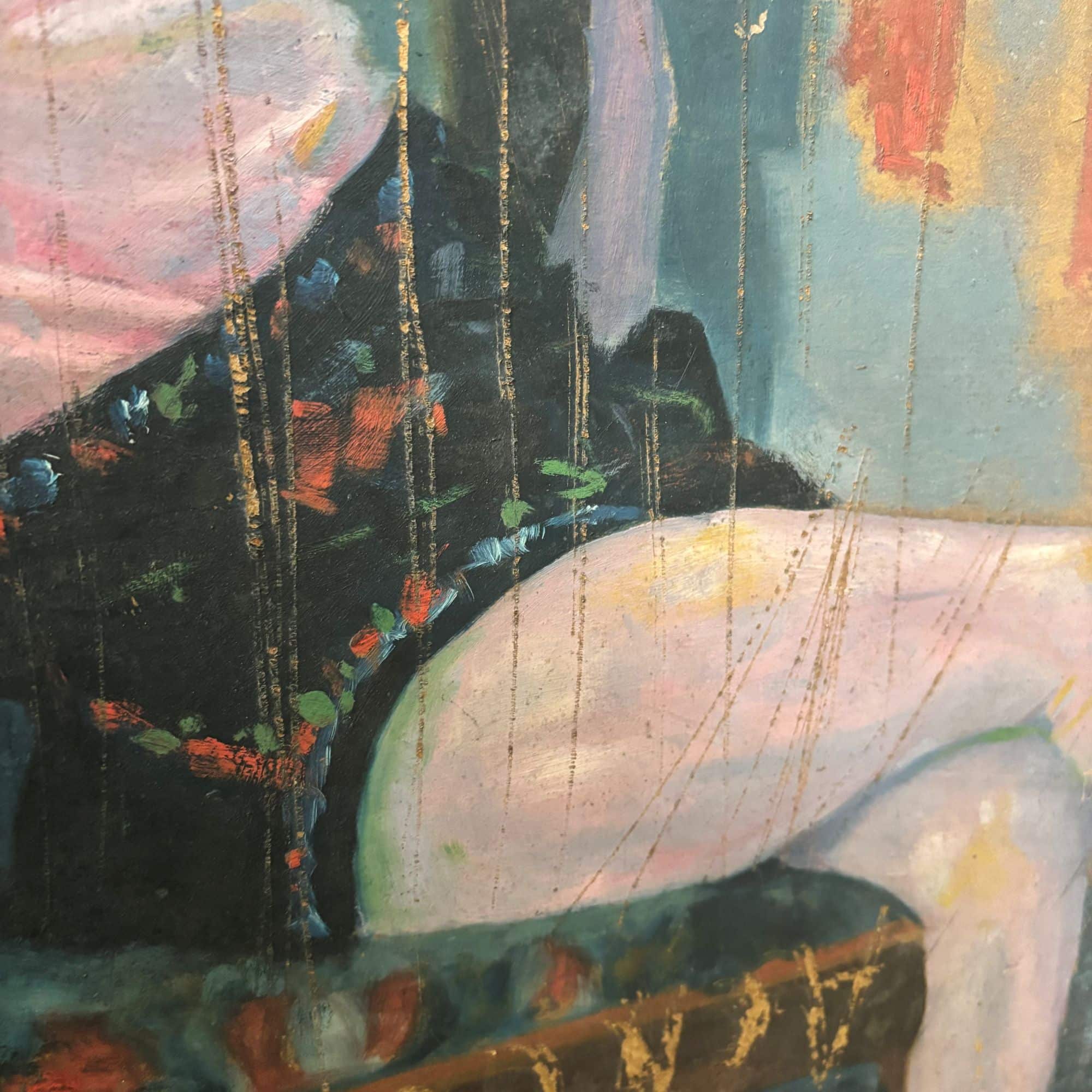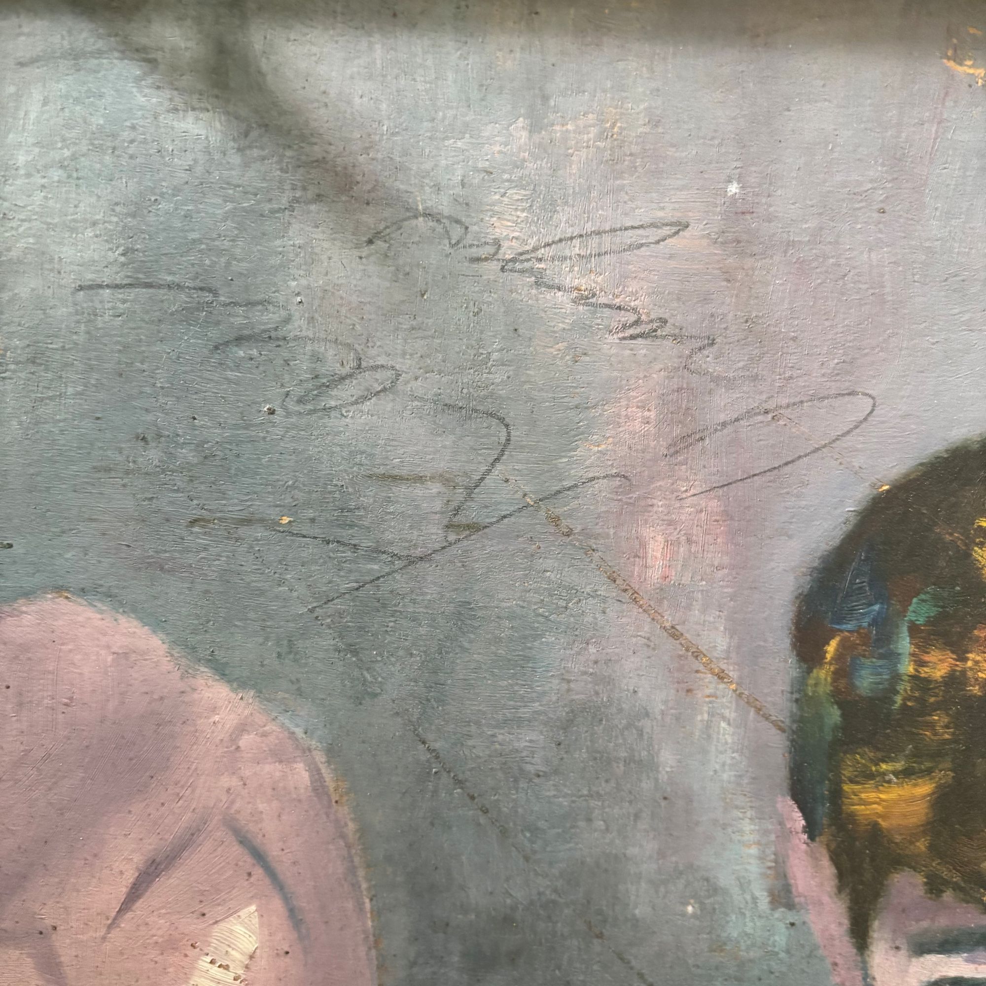 Wonderful colours and setting. This work is unfinished it seems as has text and scratched on it. However, this makes it also interesting..