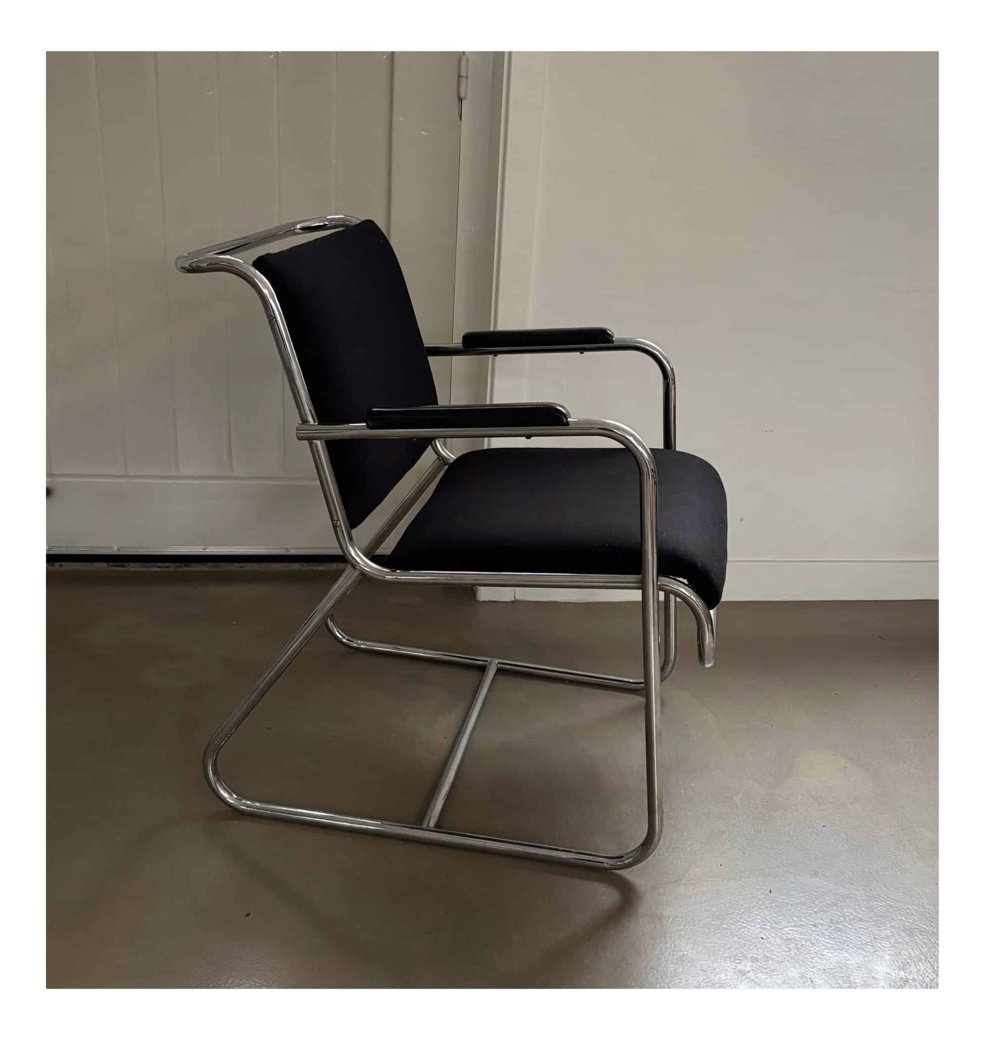 Chromed tubular metal frame, black wooden armrests, upholstered with a black fabric.