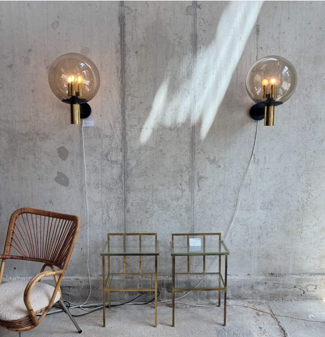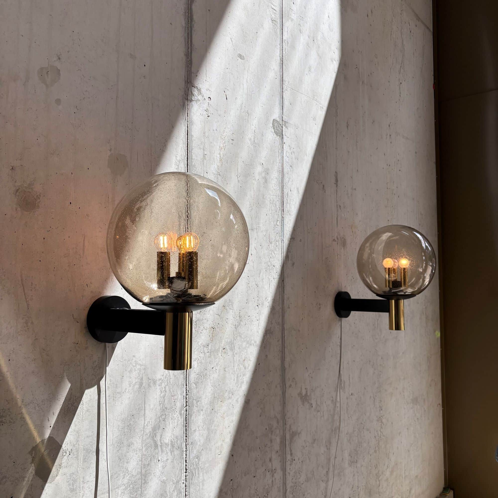 Wondeful and rare set of wall lights from Glashütte Limburg, Germany, 1970s. Not easy to find, especially not this size, with 3 sockets per lamp and a smoke glass shade with a diameter of no less than 34 cm! Set of 2 available in an excellent condition.