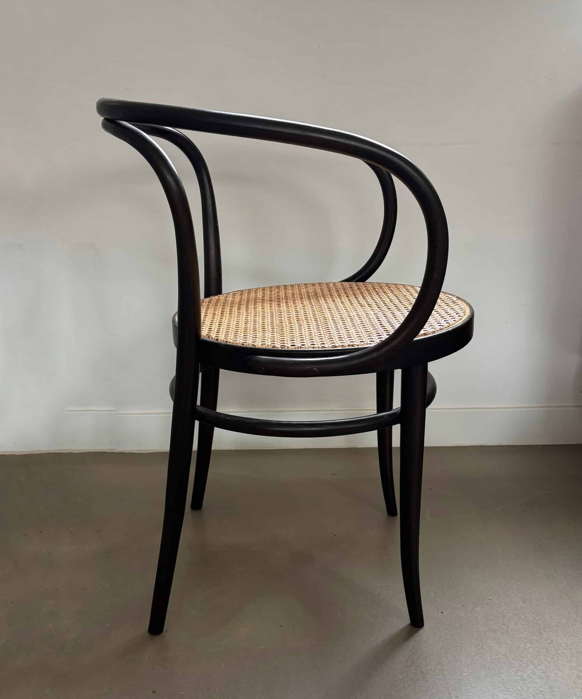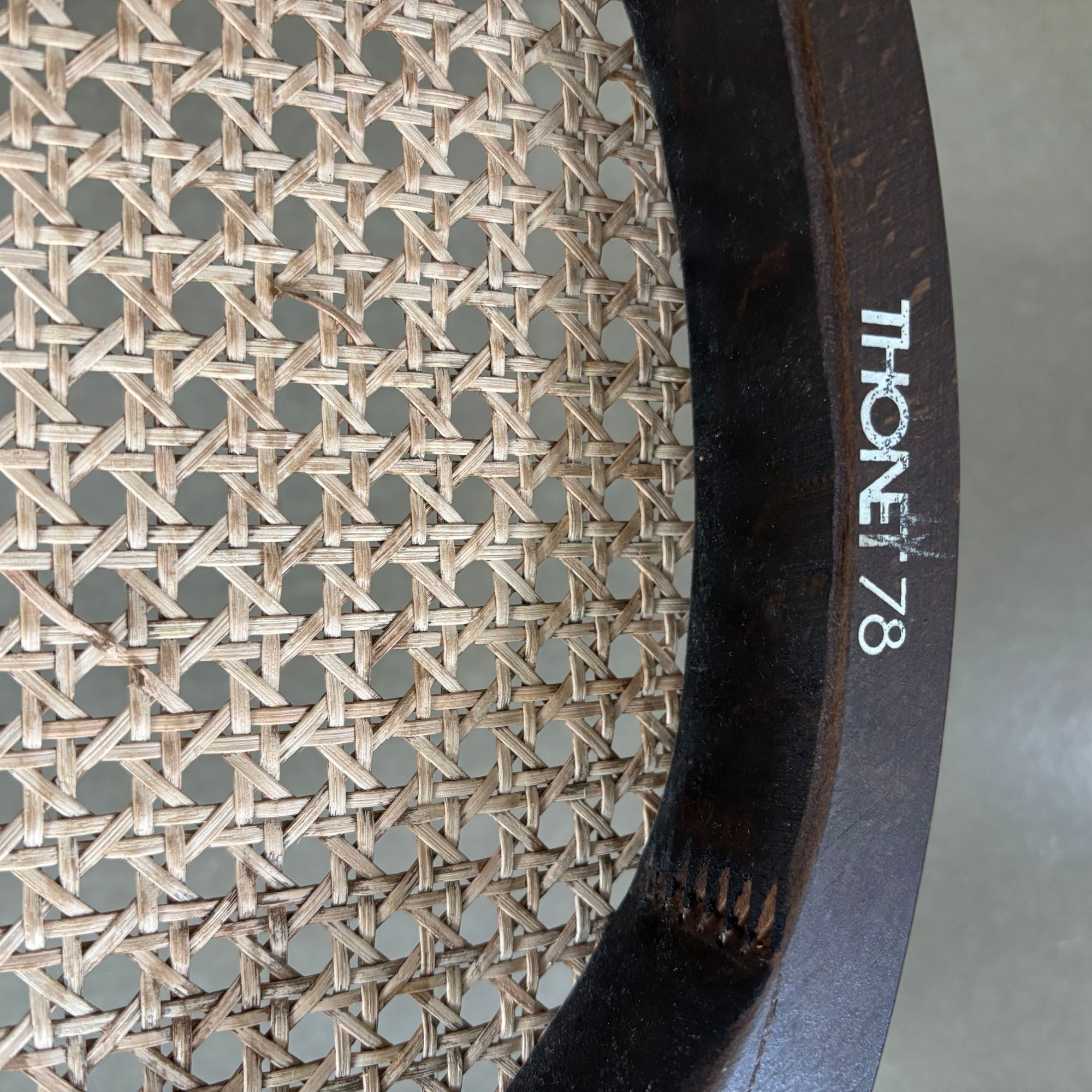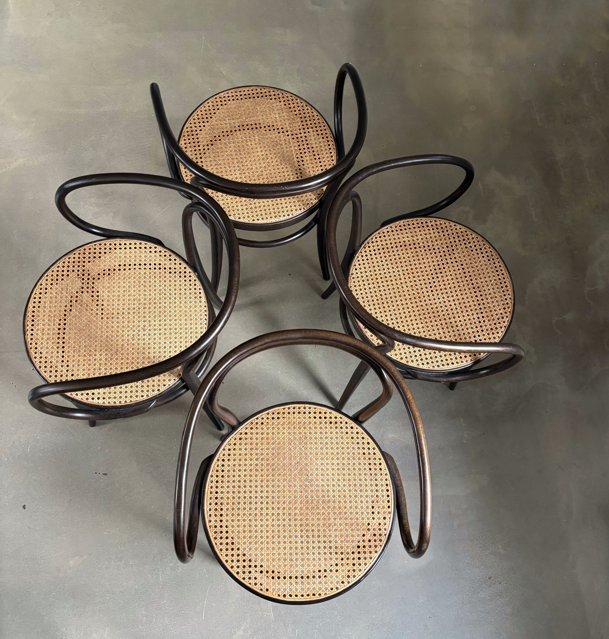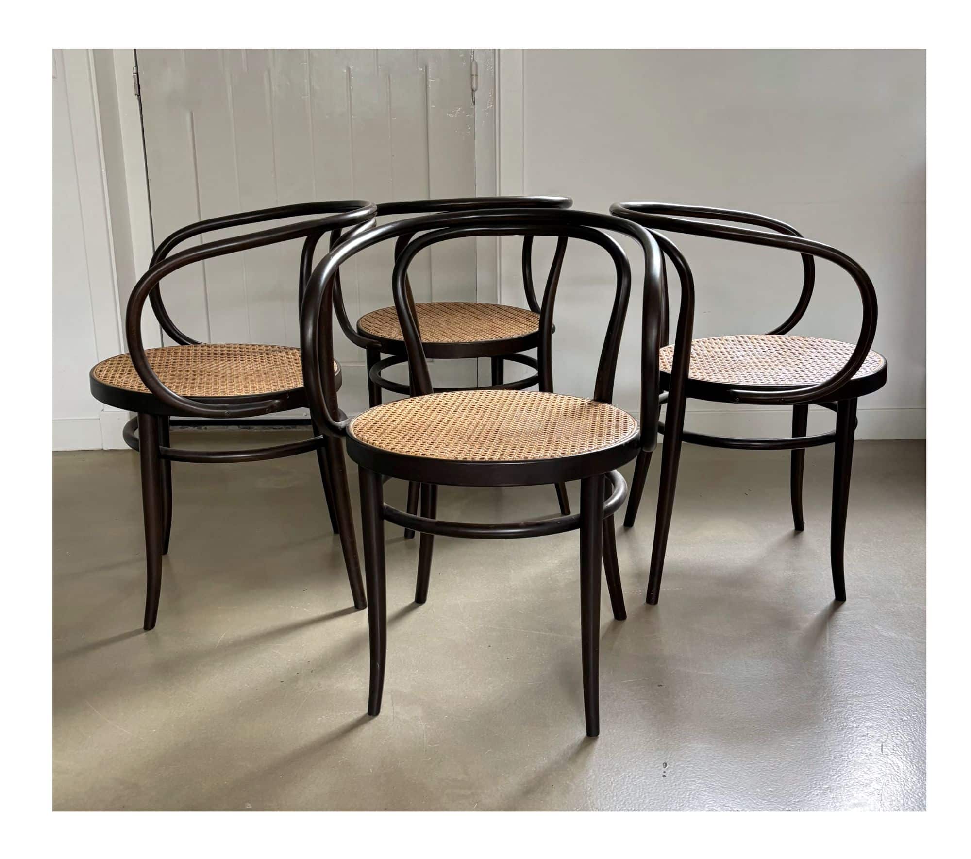 Beautiful set of 4 armchairs known as model 209 or the Wiener Stühl. Designed for Thonet around 1900. This set has brand marks underneath its seat (Thonet 78 as they have been produced in 1978). Dark brown, bentwooden frame with a seat of woven cane/wicker (webbing). This model became well known as French designer Le Corbusier marked it as one of his favorites and used it in his interior projects.