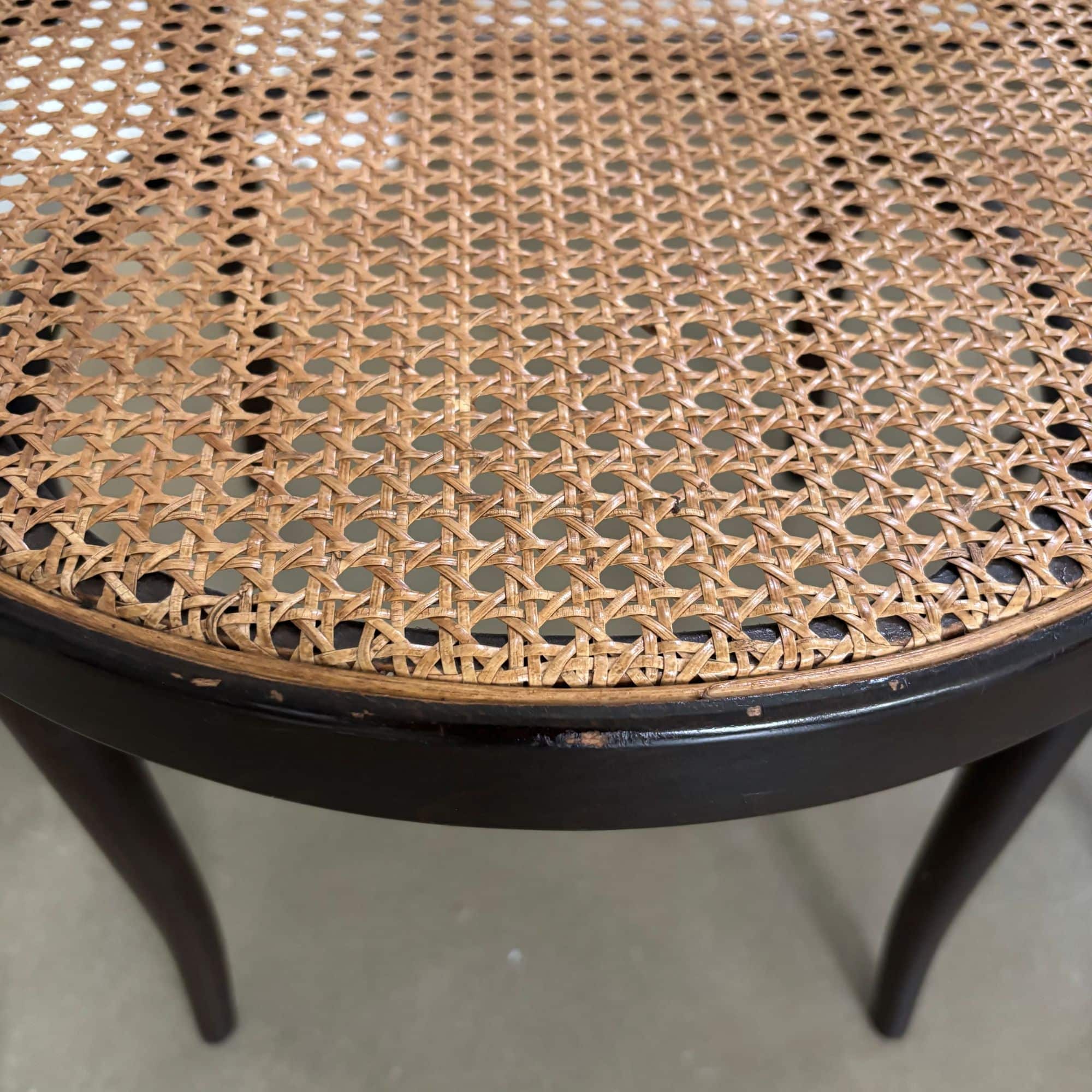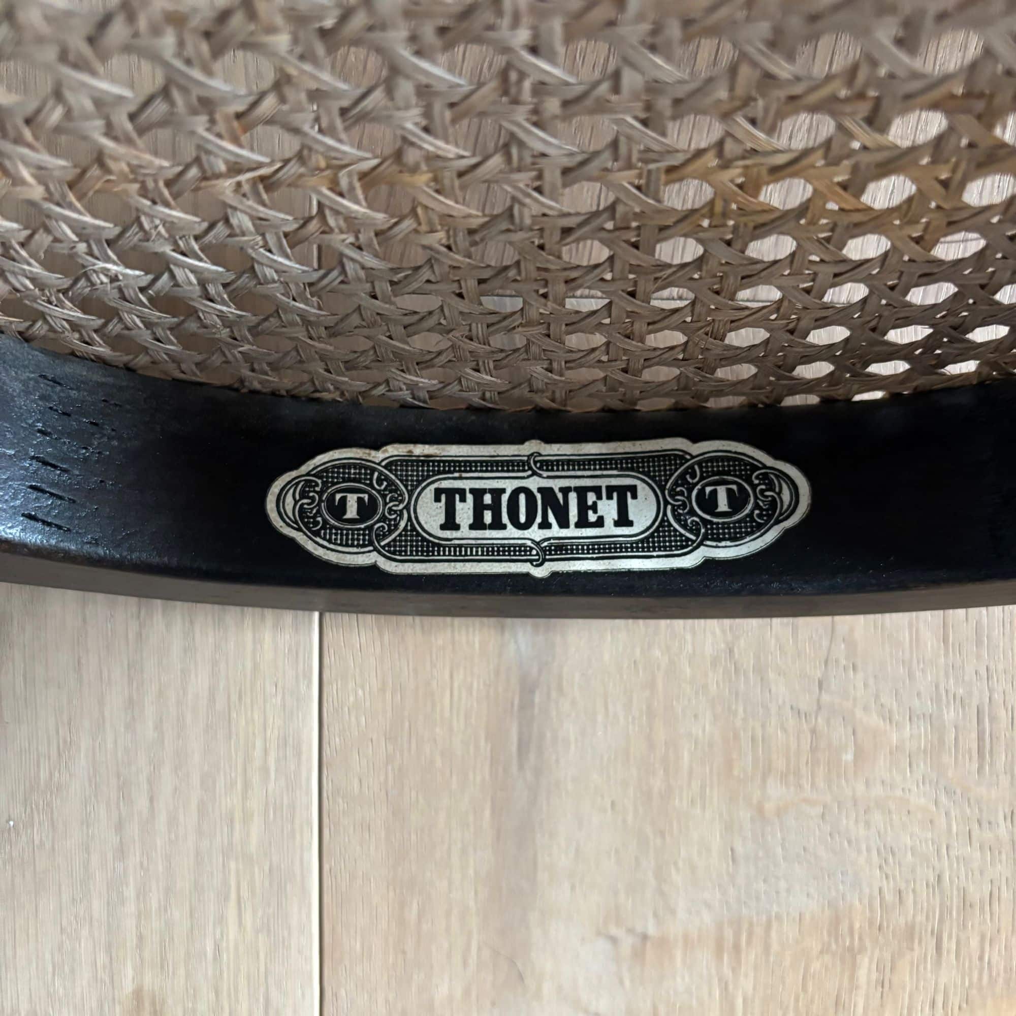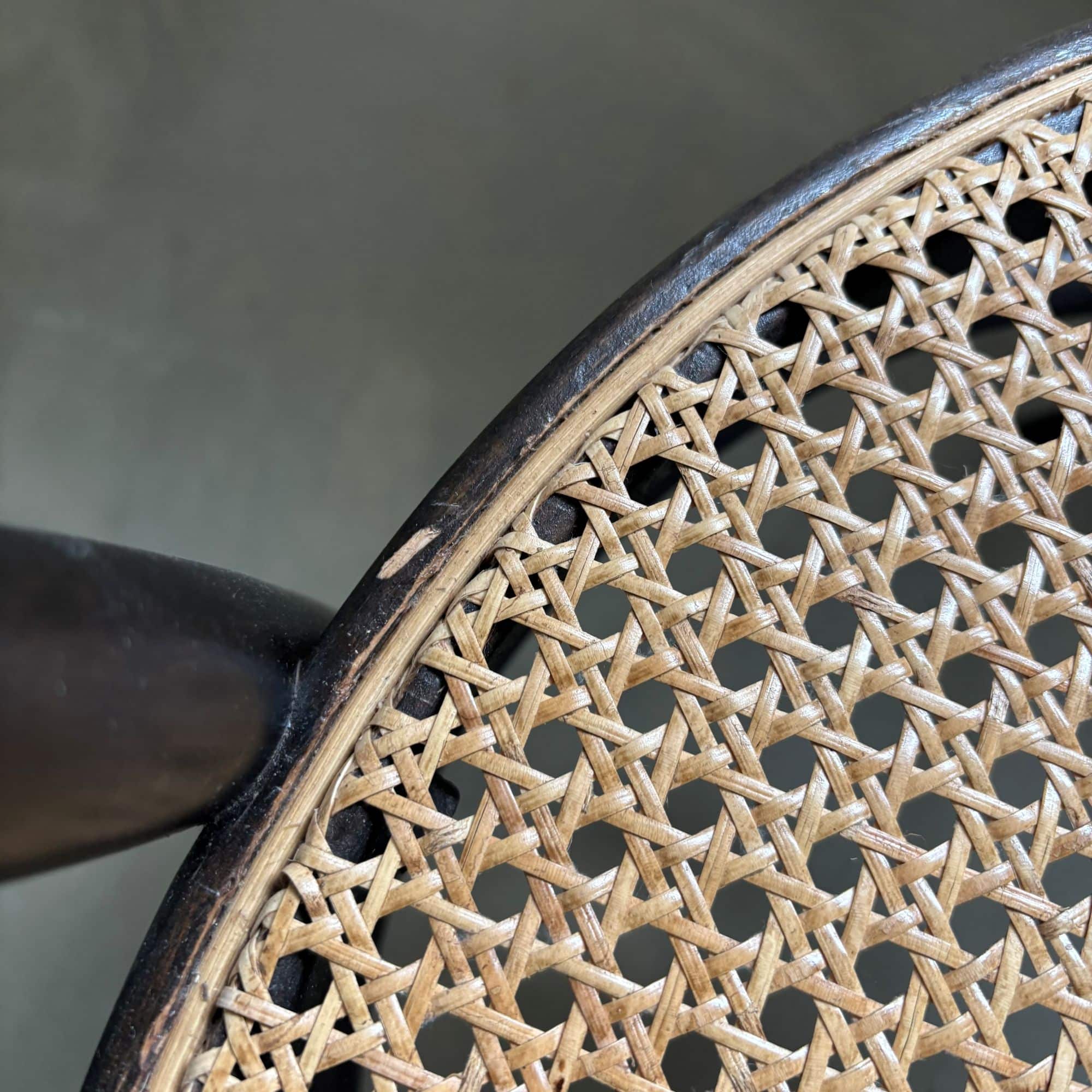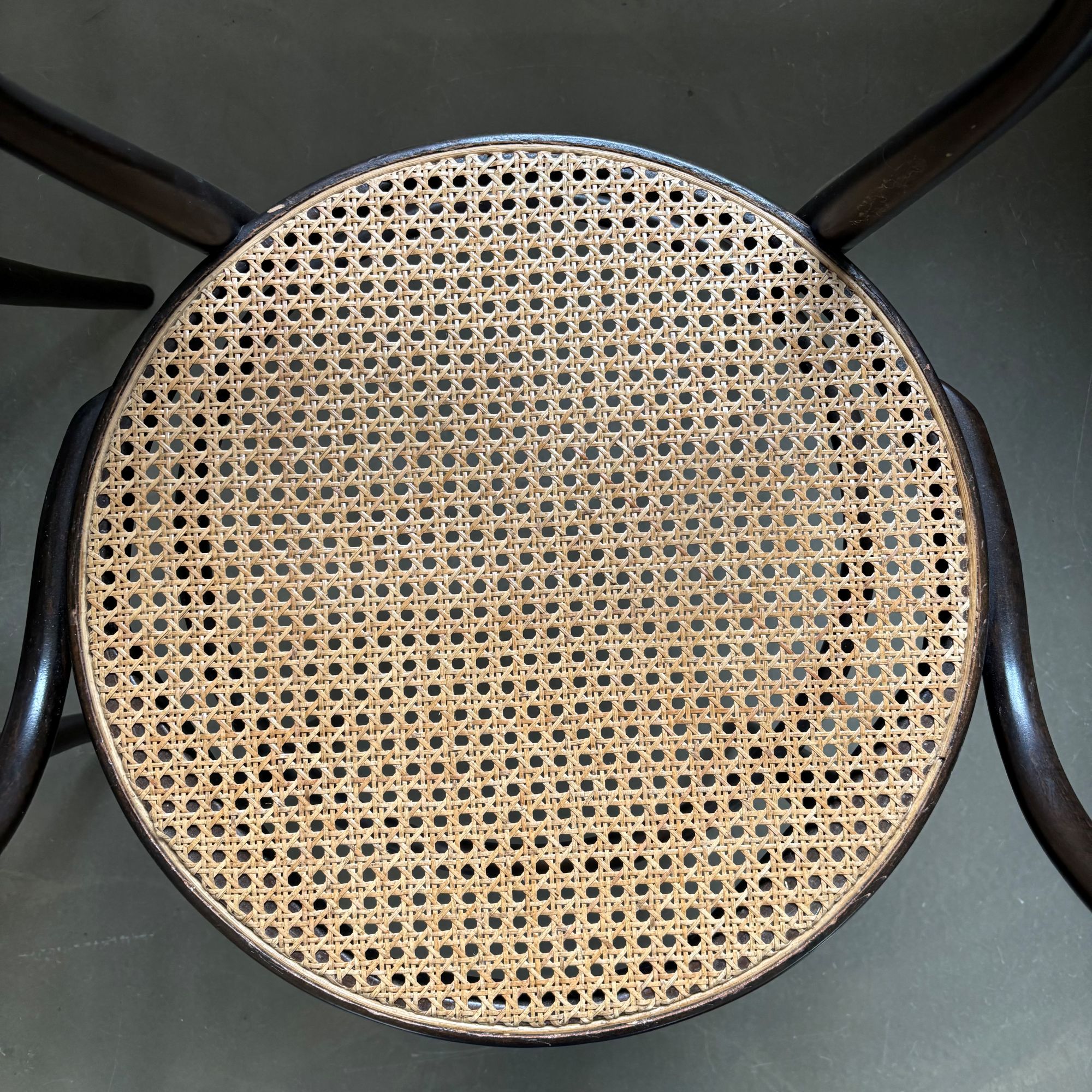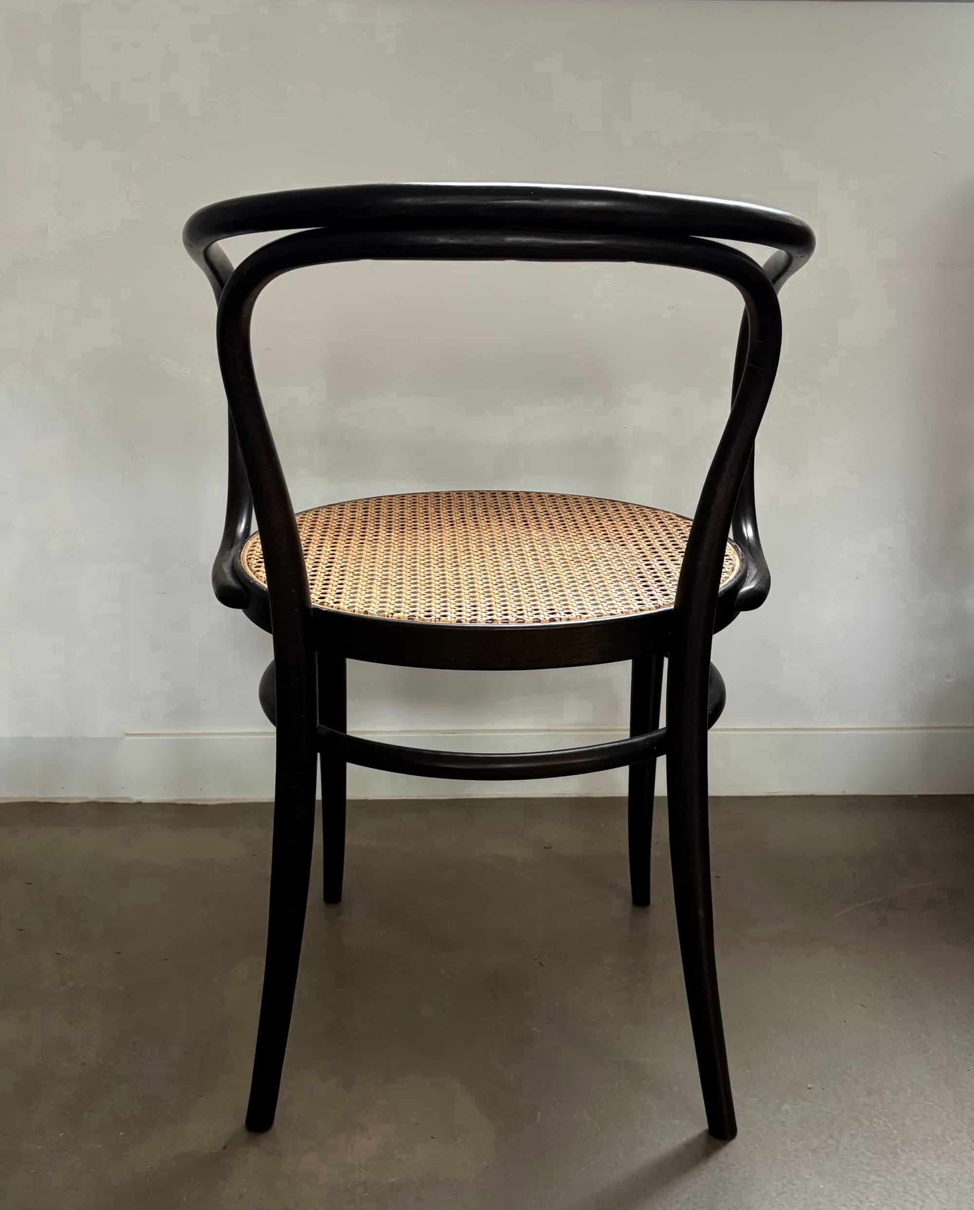 Beautiful set of 4 armchairs known as model 209 or the Wiener Stühl. Designed for Thonet around 1900. This set has brand marks underneath its seat (Thonet 78 as they have been produced in 1978). Dark brown, bentwooden frame with a seat of woven cane/wicker (webbing). This model became well known as French designer Le Corbusier marked it as one of his favorites and used it in his interior projects.