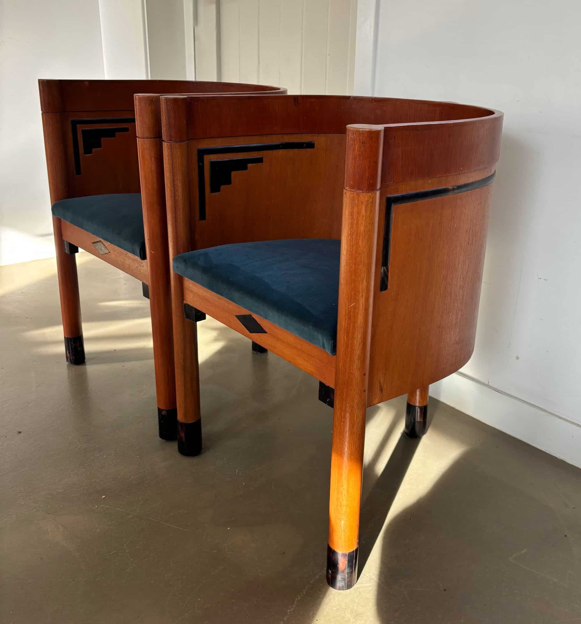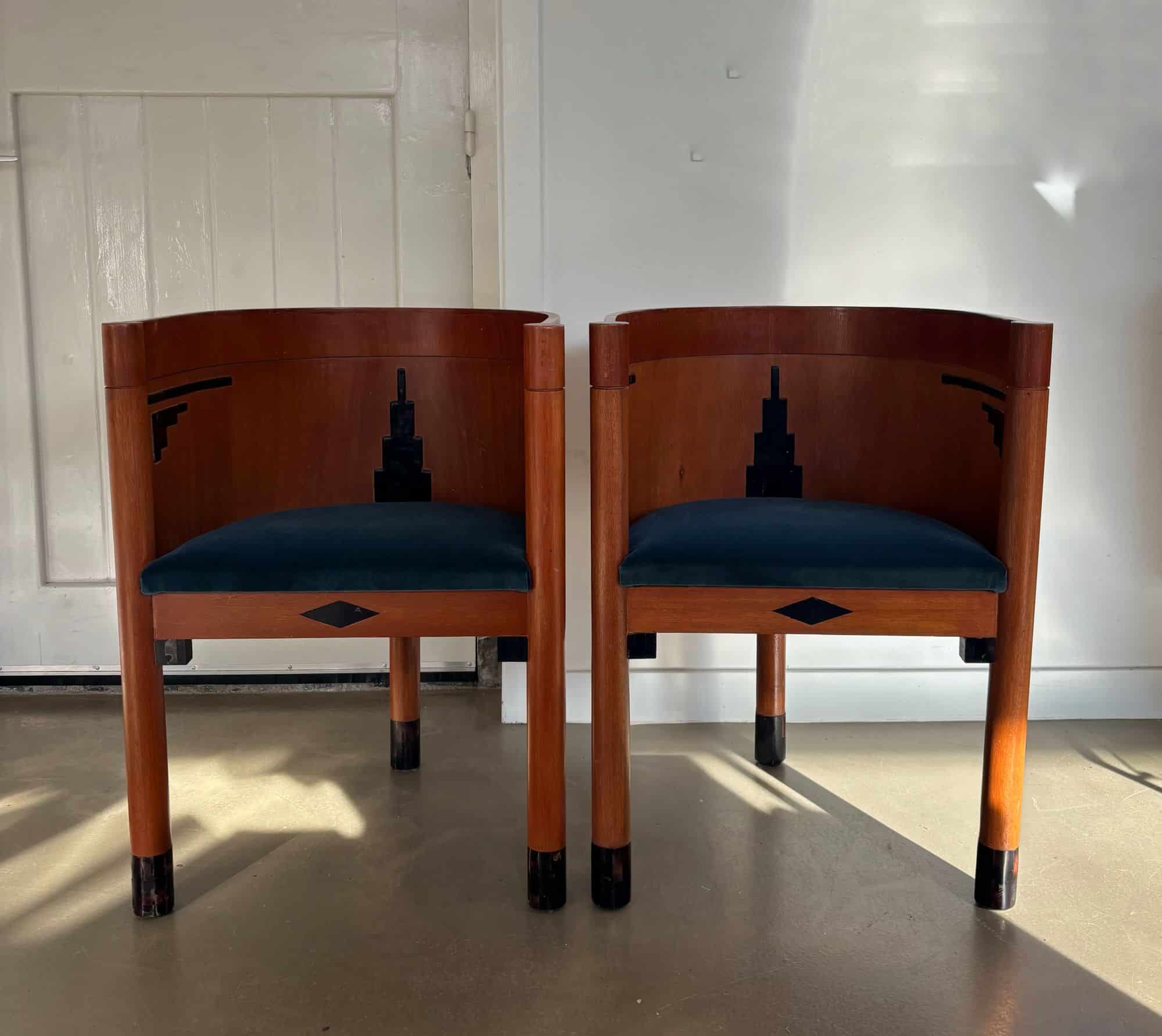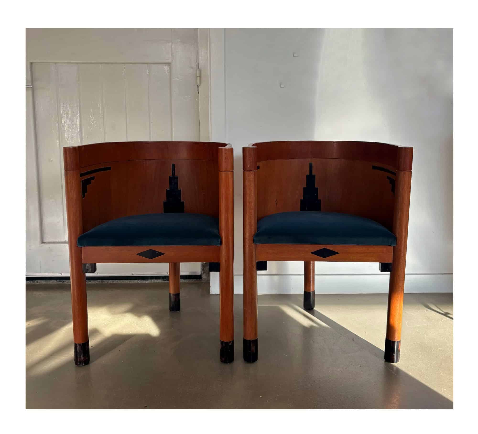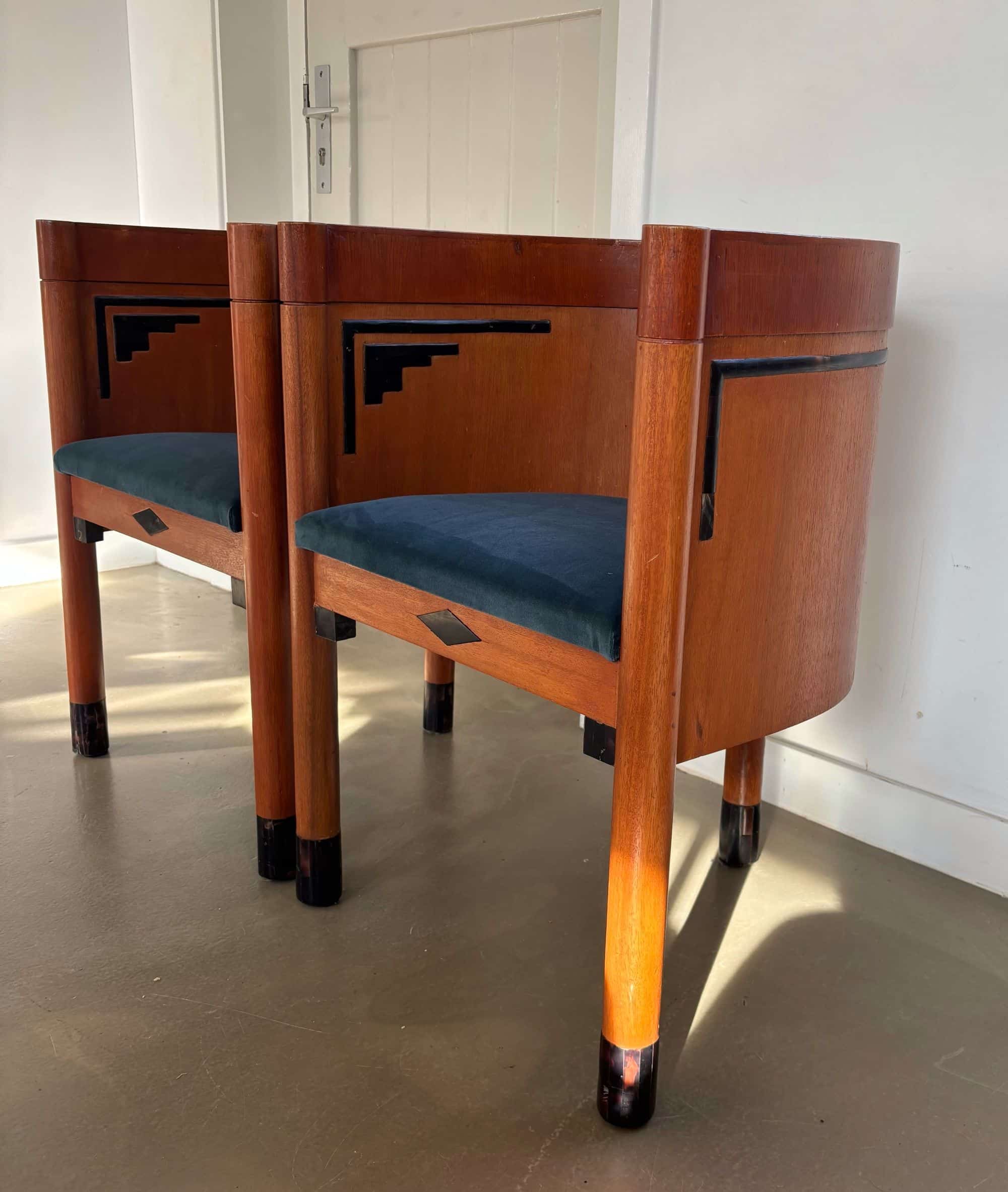 What’s unique are the art deco patterned inlays, decoration on the wood and at the lower parts of the chairs’ legs.