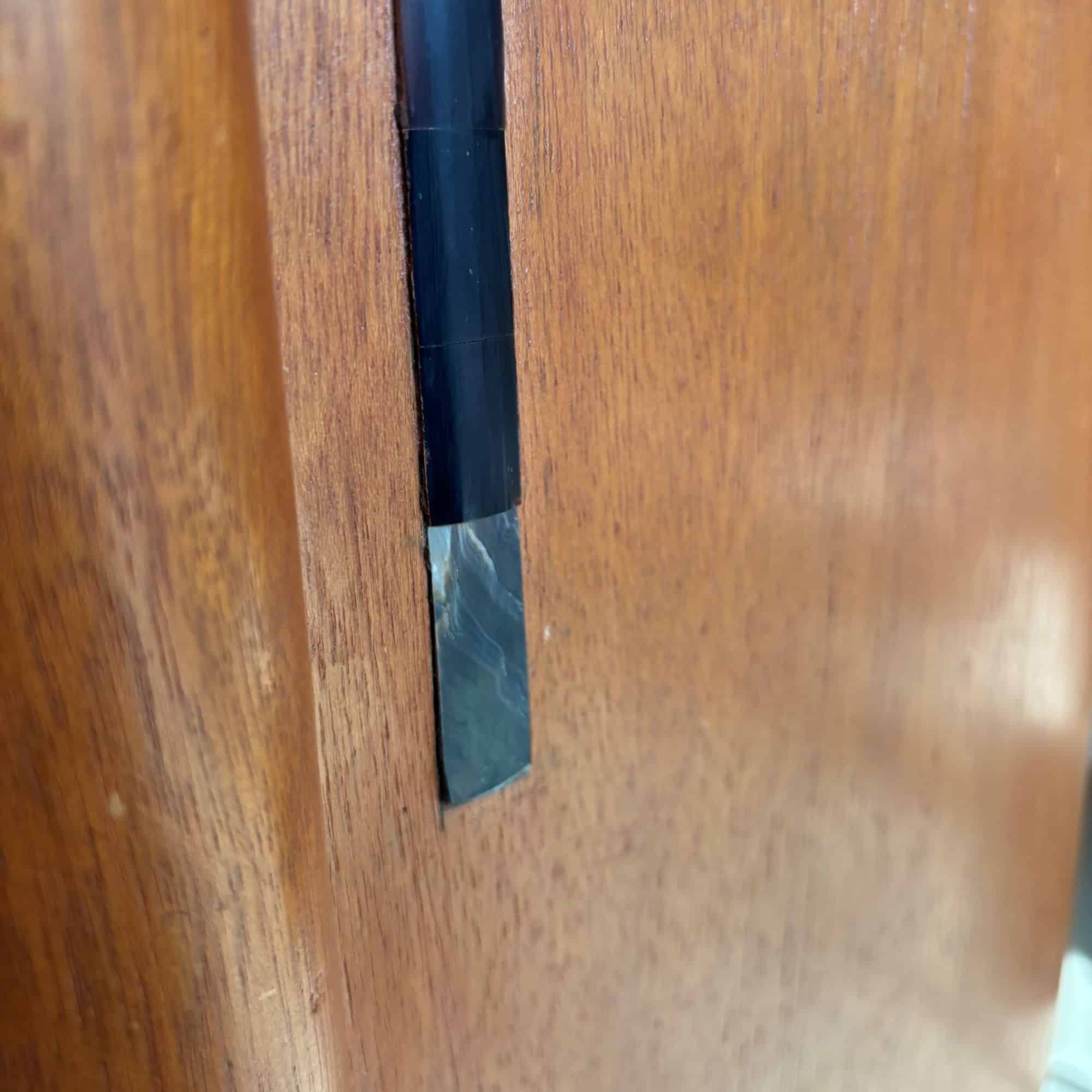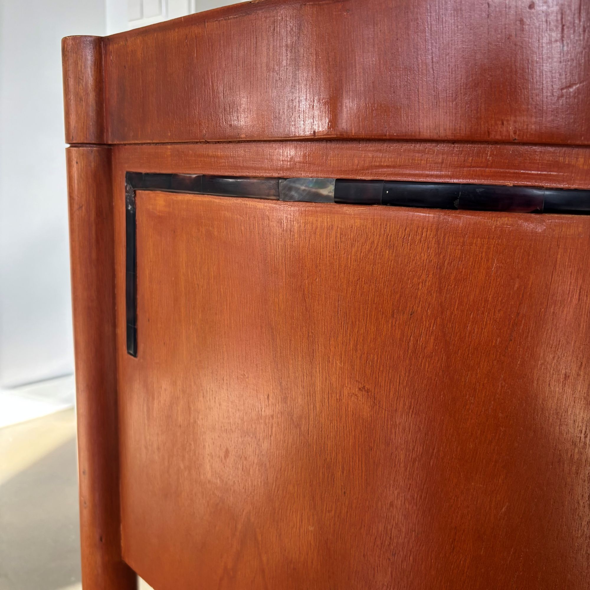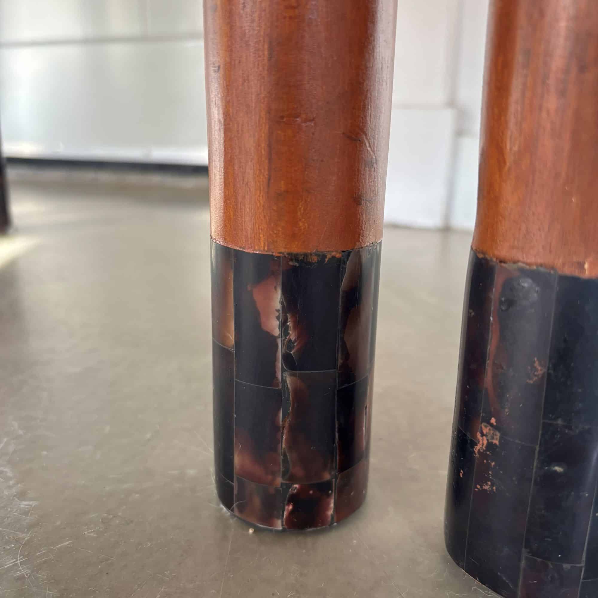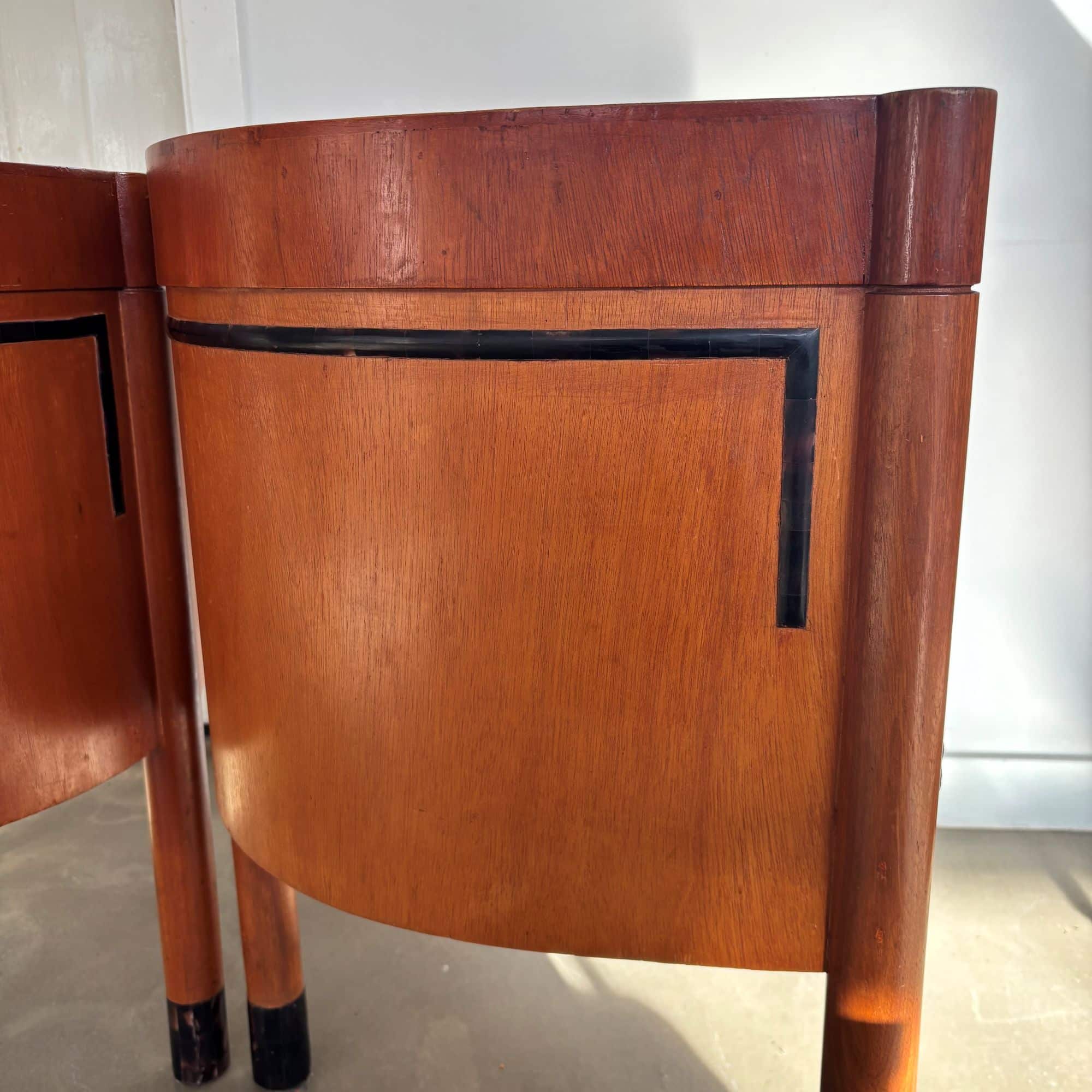 What’s unique are the art deco patterned inlays, decoration on the wood and at the lower parts of the chairs’ legs.