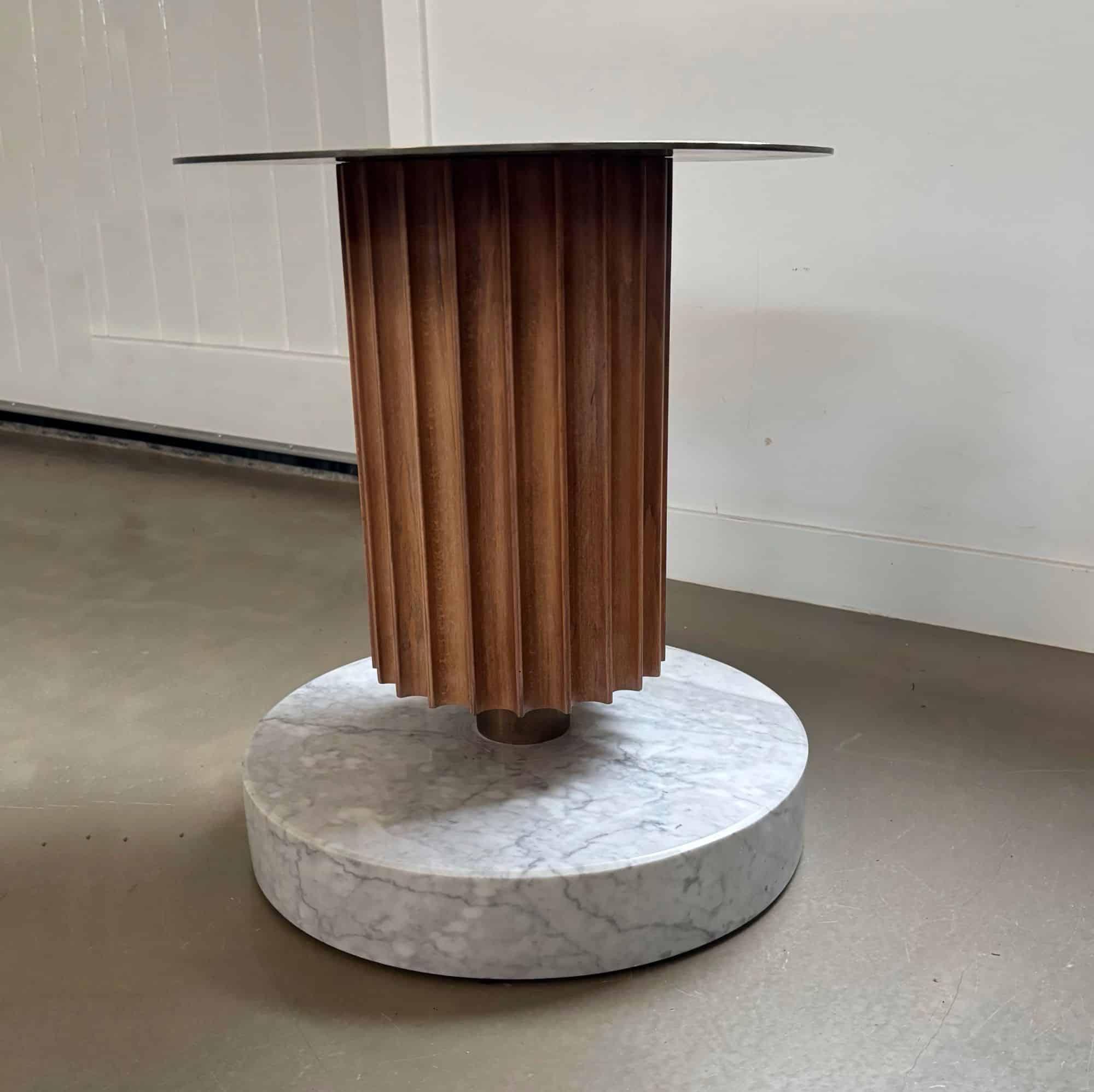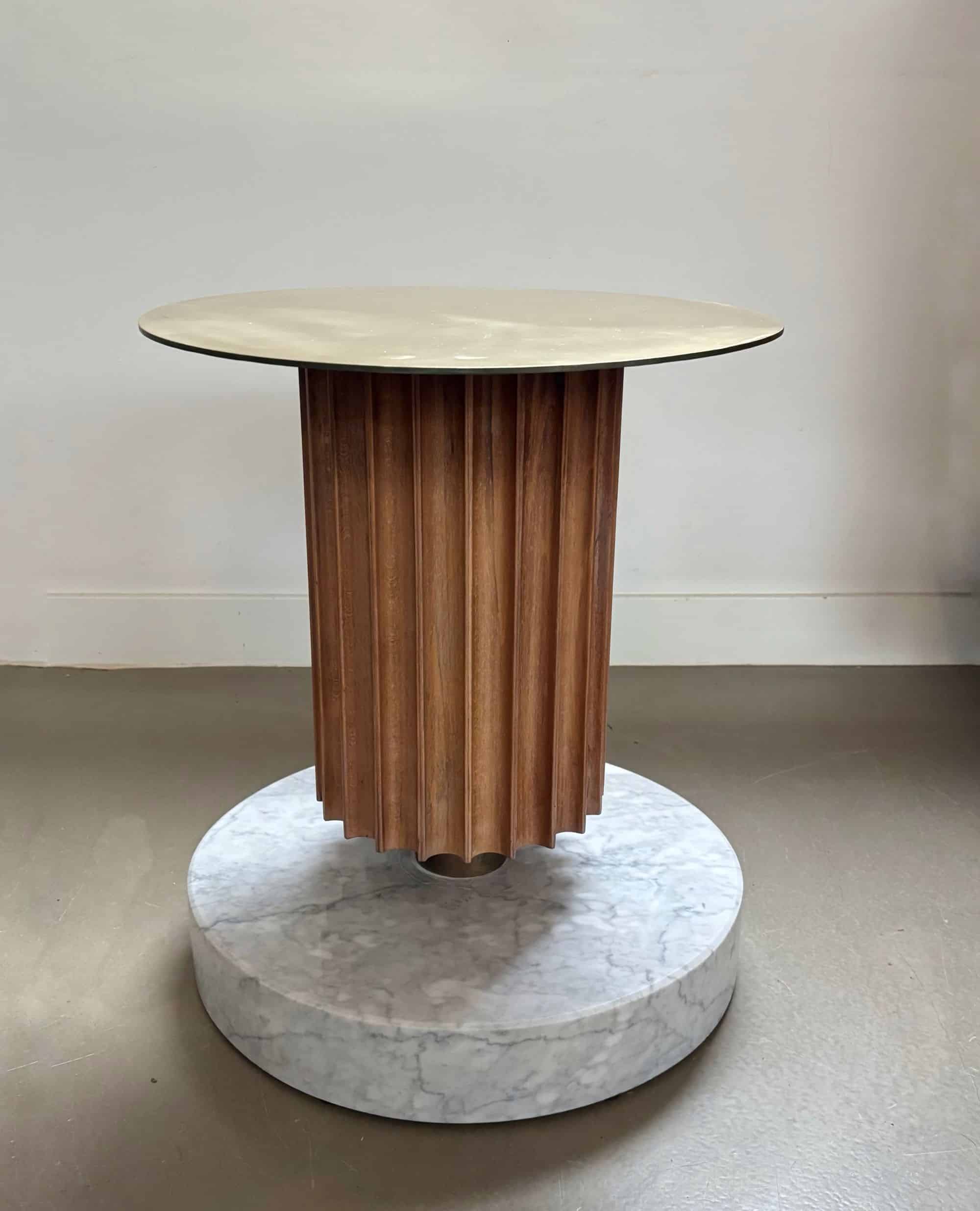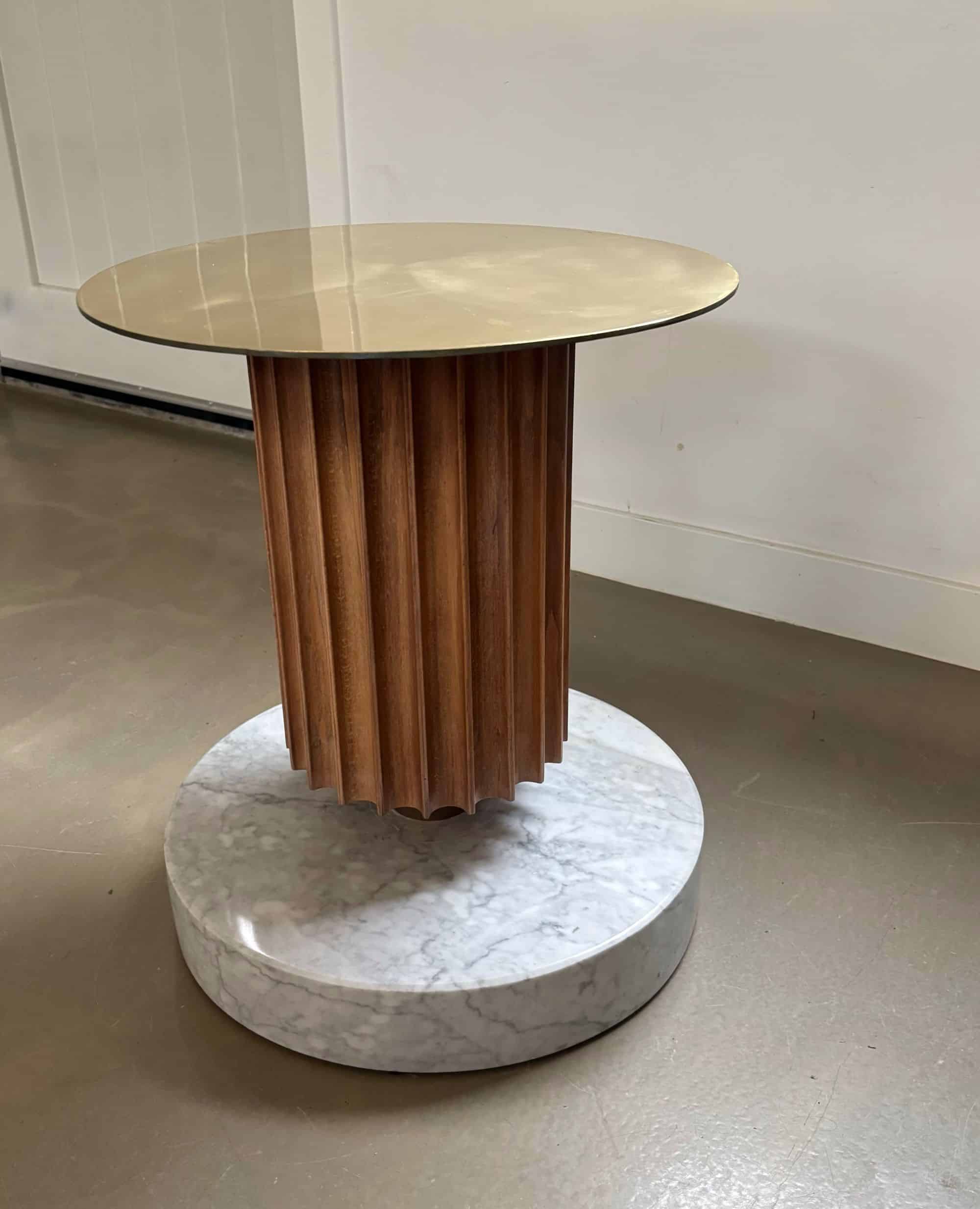 Side table or piëdestal, heavy marble base, wood and metal round top.