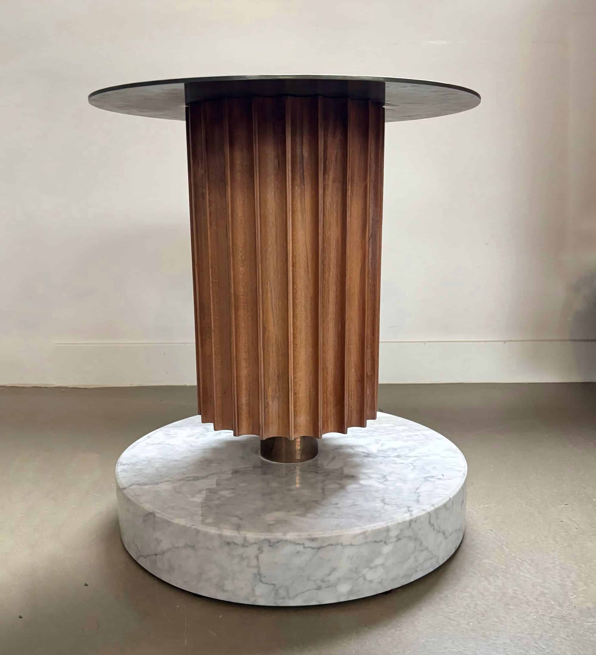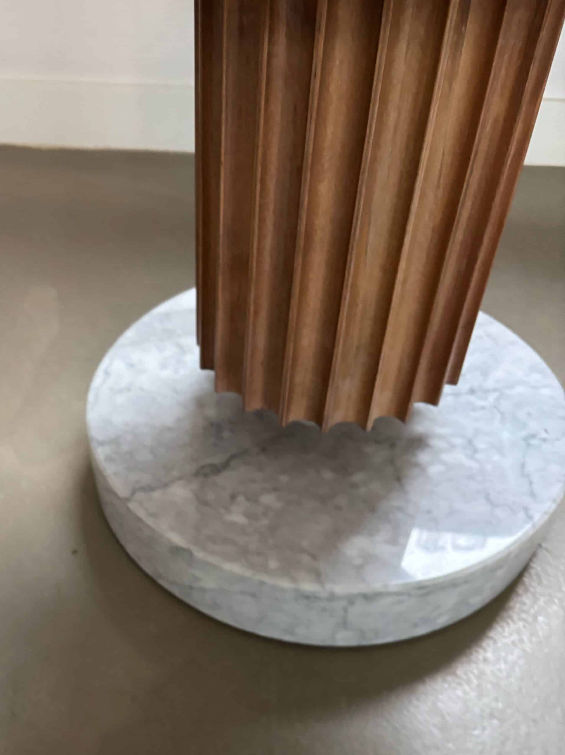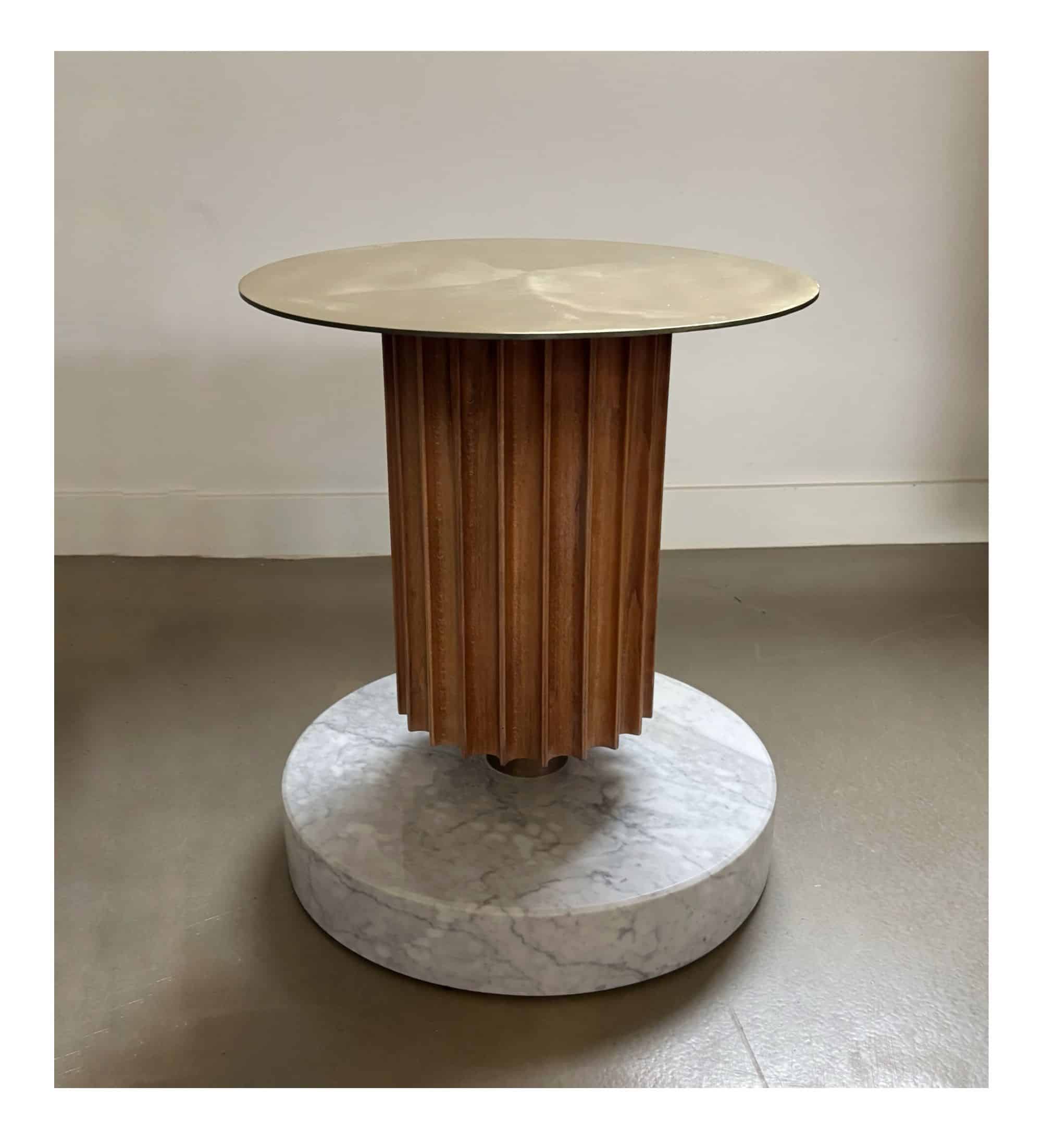 Side table or piëdestal, heavy marble base, wood and metal round top.