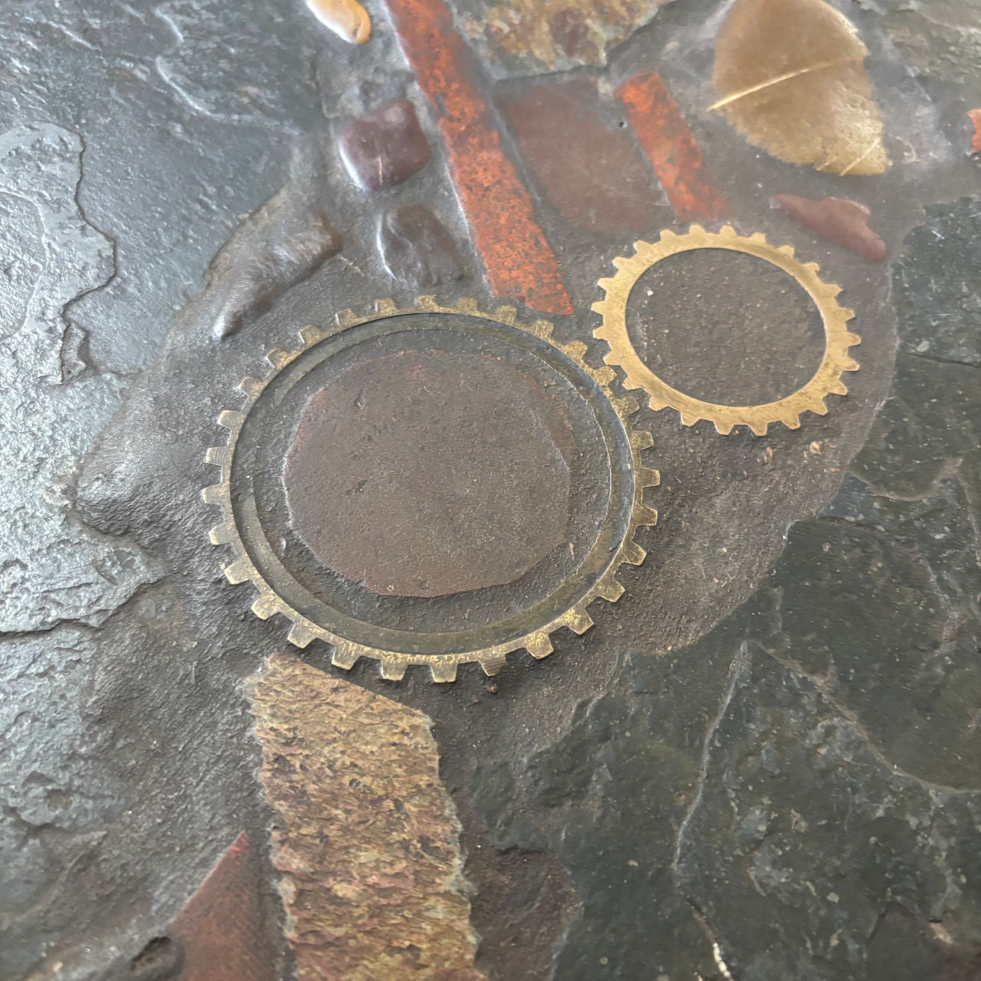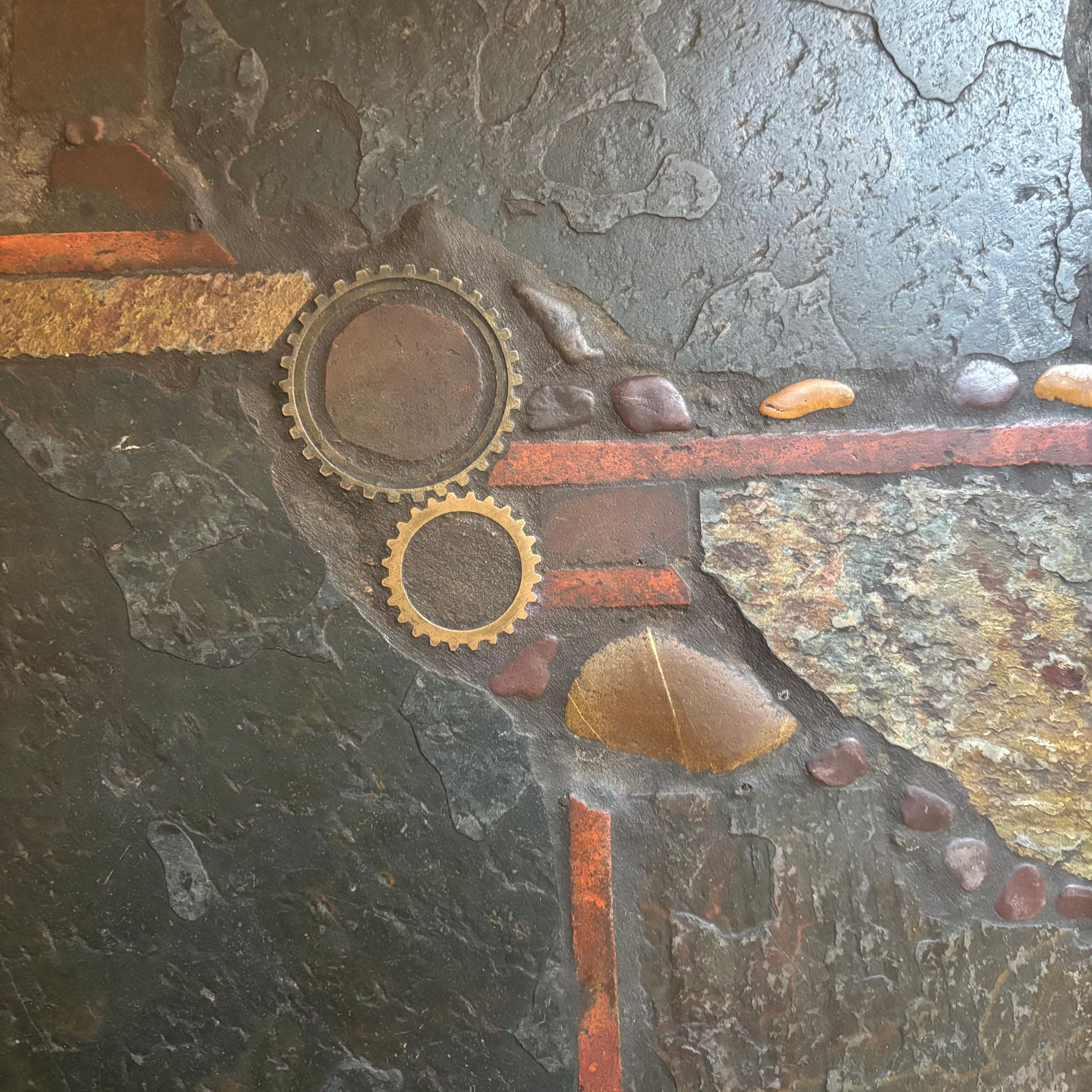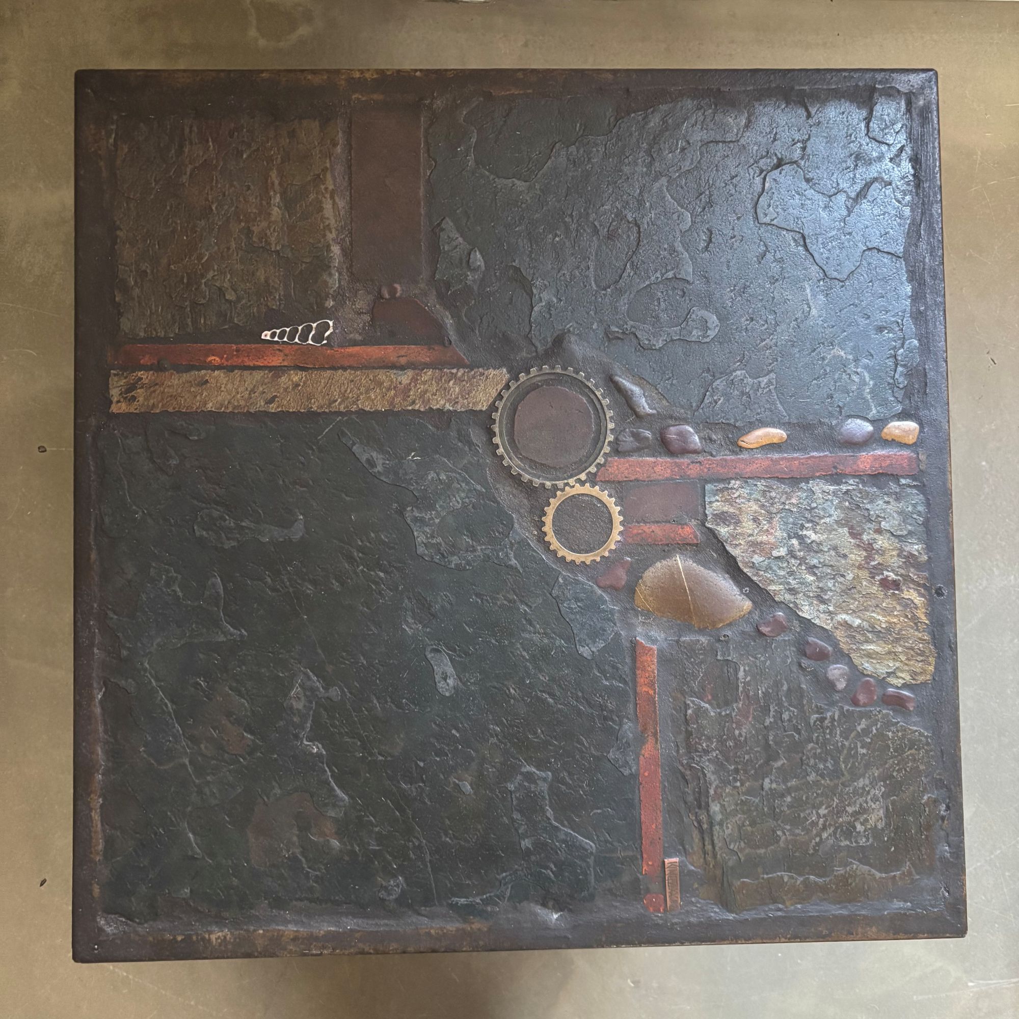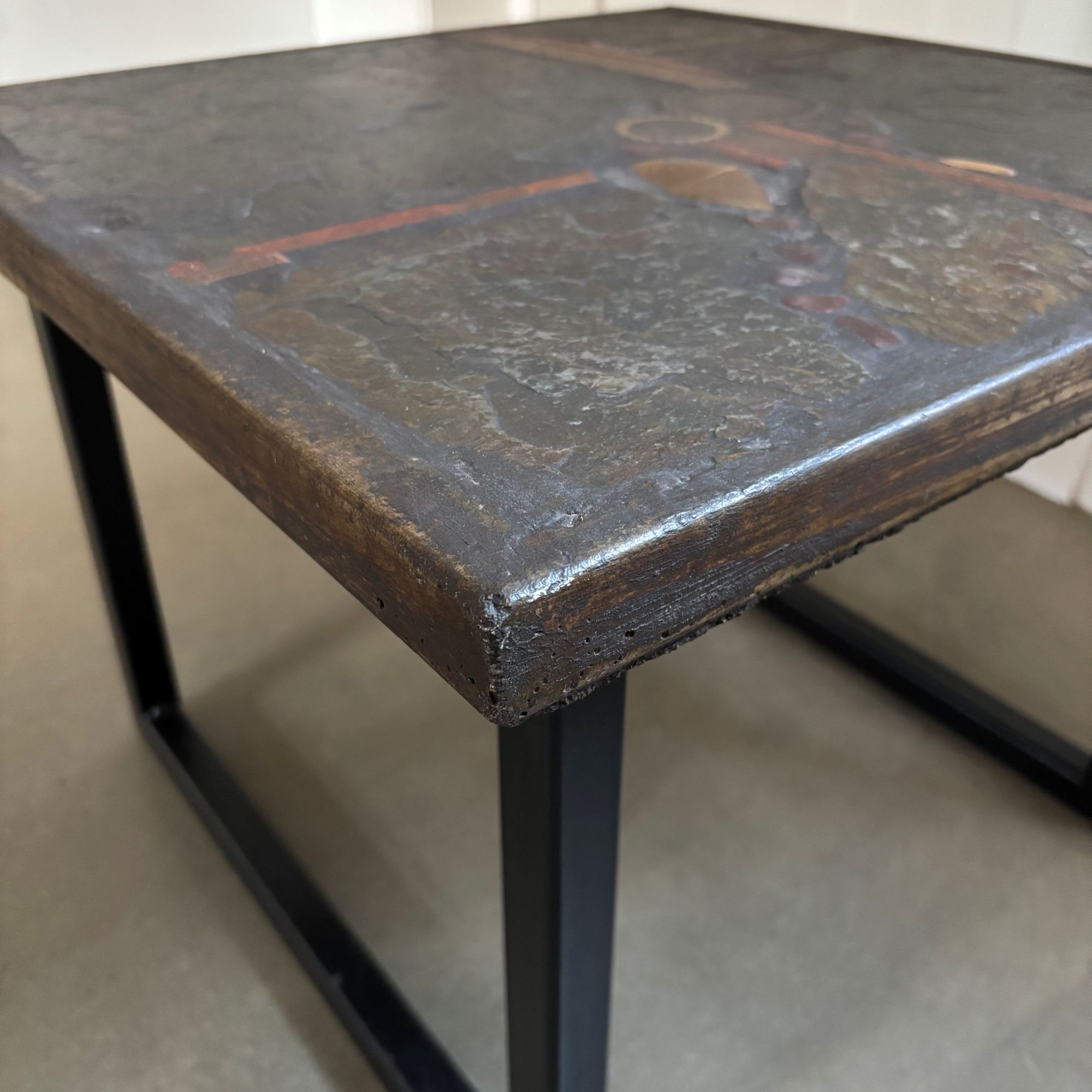 Its unique heavy concrete top with inlays of (slat)stone and brass decoration, lies loose on a minimalistic black metal frame.
